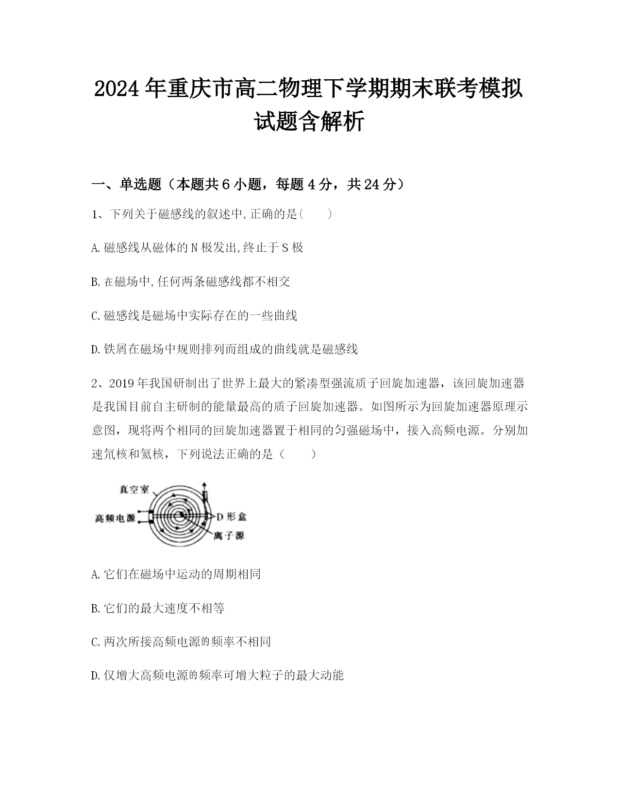 2024年重庆市高二物理下学期期末联考模拟试题含解析一、单选题(本题共6小题,每题4分,共24分)1、下列关于磁感线的叙述中,正确的是()A.磁感线从磁体的N极发出,终止于S极B.磁场中,任何两条磁感线都不相交C.磁感线是磁场中实际存在的一些曲线D.铁屑在磁场中规则排列而组成的曲线就是磁感线2、2019年我国研制出了世界上最大的紧凑型强流质子回旋加速器,该回旋加速器是我国目前自主研制的能量最高的质子回旋加速器。如图所示为回旋加速器原理示意图,现将两个相同的回旋加速器置于相同的匀强磁场中,接入高频电源。分别