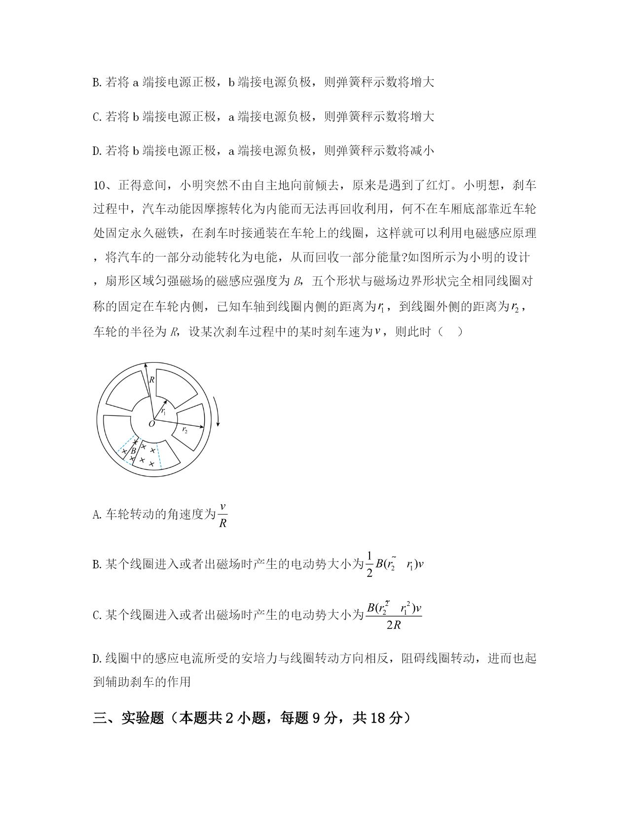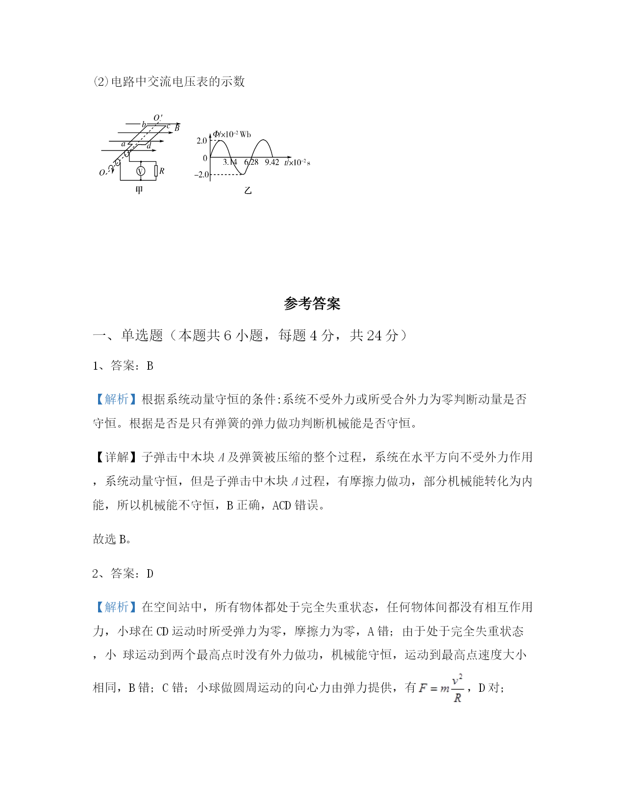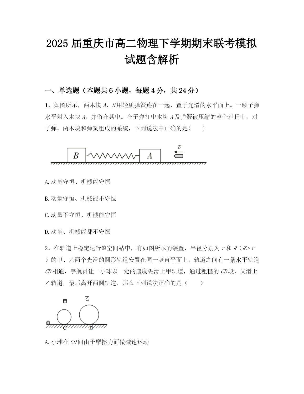 2025届重庆市高二物理下学期期末联考模拟试题含解析一、单选题(本题共6小题,每题4分,共24分)1、如图所示,两木块A、B用轻质弹簧连在一起,置于光滑的水平面上。一颗子弹水平射入木块A,并留在其中。在子弹打中木块A及弹簧被压缩的整个过程中,对子弹、两木块和弹簧组成的系统,下列说法中正确的是()A.动量守恒、机械能守恒B.动量守恒、机械能不守恒C.动量不守恒、机械能守恒D.动量、机械能都不守恒2、在轨道上稳定运行空间站中,有如图所示的装置,半径分别为r和R(R>r)的甲、乙两个光滑的圆形轨道安置在同一竖直