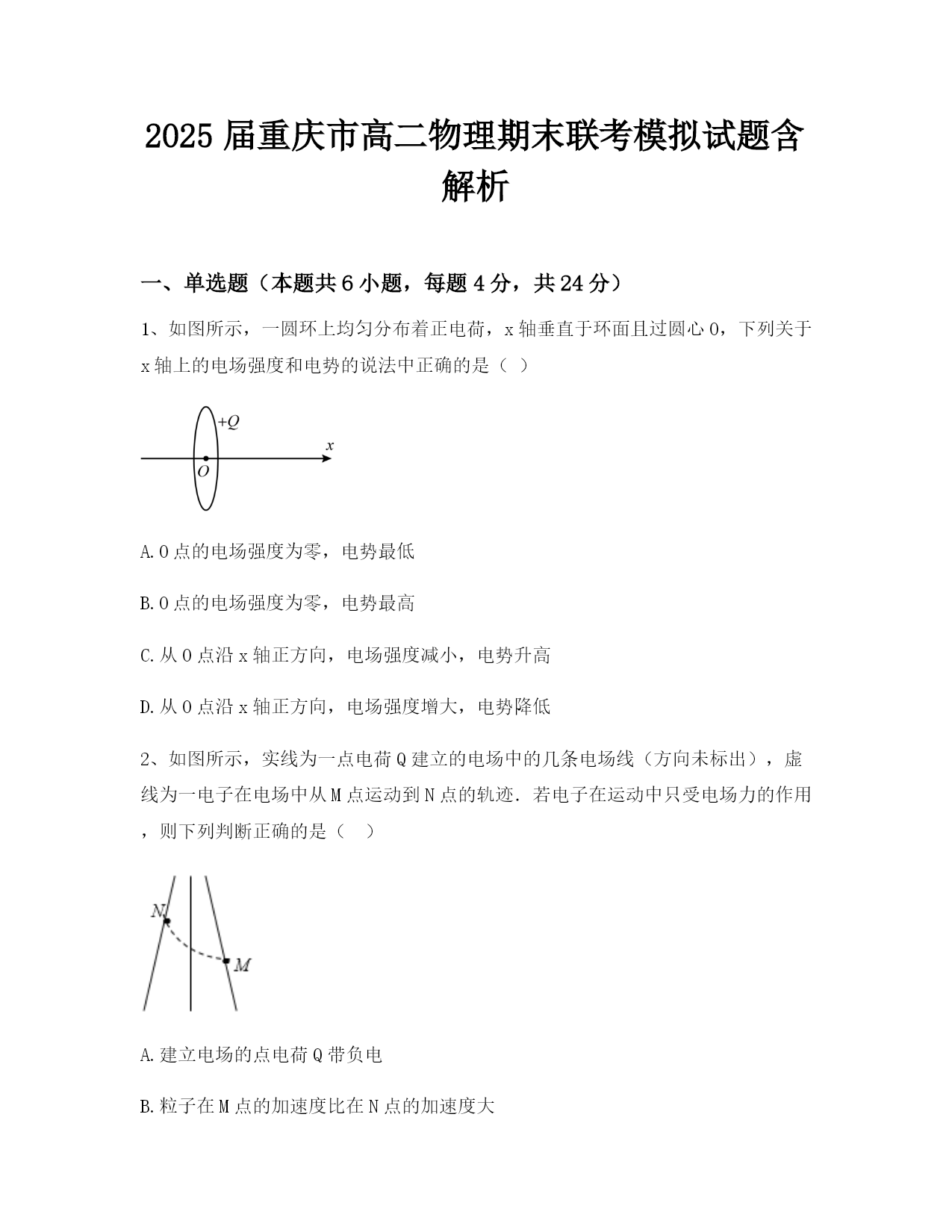 2025届重庆市高二物理期末联考模拟试题含解析一、单选题(本题共6小题,每题4分,共24分)1、如图所示,一圆环上均匀分布着正电荷,x轴垂直于环面且过圆心O,下列关于x轴上的电场强度和电势的说法中正确的是()A.O点的电场强度为零,电势最低B.O点的电场强度为零,电势最高C.从O点沿x轴正方向,电场强度减小,电势升高D.从O点沿x轴正方向,电场强度增大,电势降低2、如图所示,实线为一点电荷Q建立的电场中的几条电场线(方向未标出),虚线为一电子在电场中从M点运动到N点的轨迹.若电子在运动中只受电场力的作用,