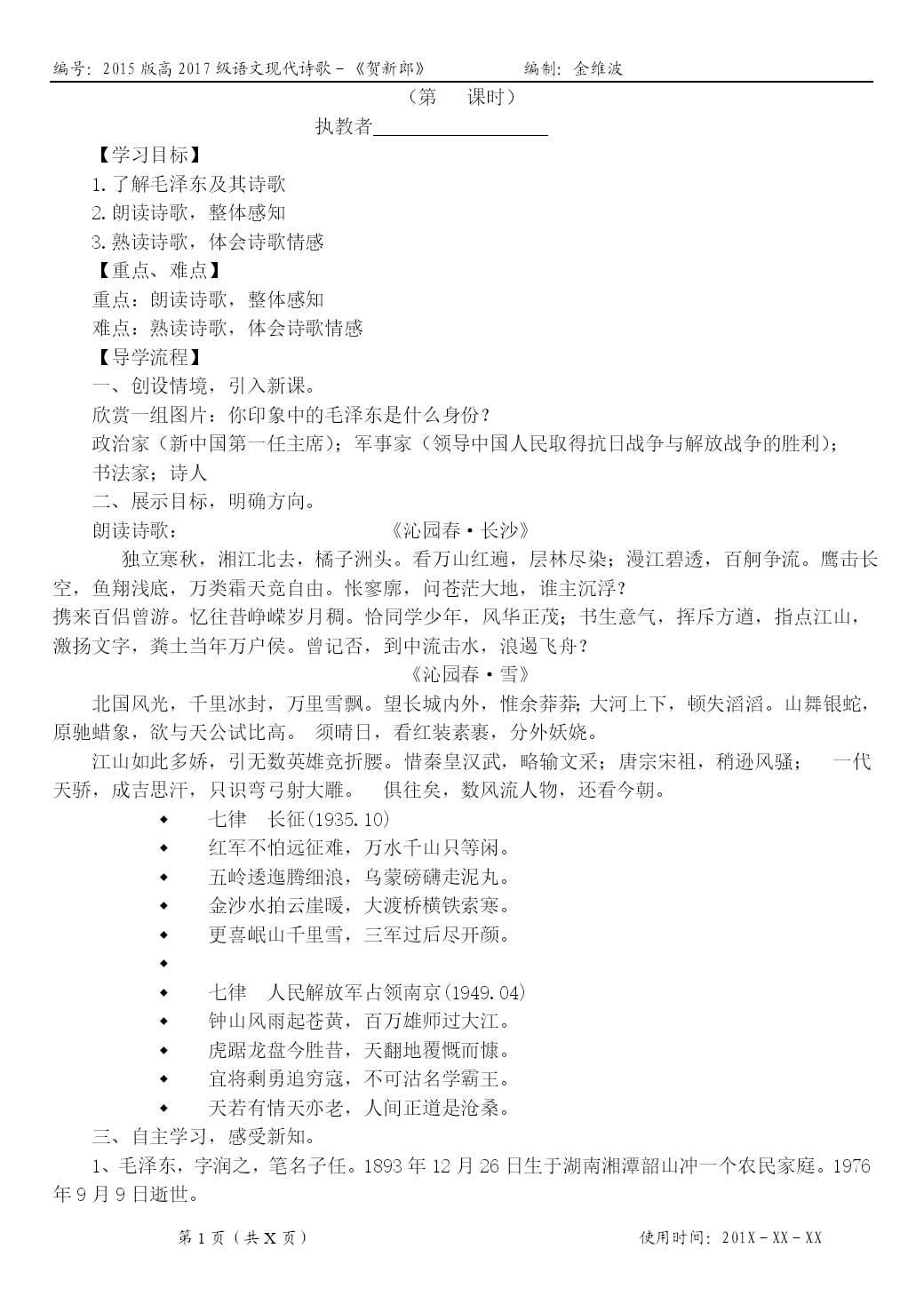 编号:2015版高2017级语文现代诗歌-《贺新郎》编制:金维波第页(共X页)使用时间:201X-XX-XX(第课时)执教者【学习目标】1.了解毛泽东及其诗歌2.朗读诗歌,整体感知3.熟读诗歌,体会诗歌情感【重点、难点】重点:朗读诗歌,整体感知难点:熟读诗歌,体会诗歌情感【导学流程】一、创设情境,引入新课。欣赏一组图片:你印象中的毛泽东是什么身份?政治家(新中国第一任主席);军事家(领导中国人民取得抗日战争与解放战争的胜利);书法家;诗人二、展示目标,明确方向。朗读诗歌:《沁园春·长沙》独