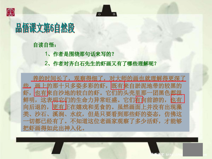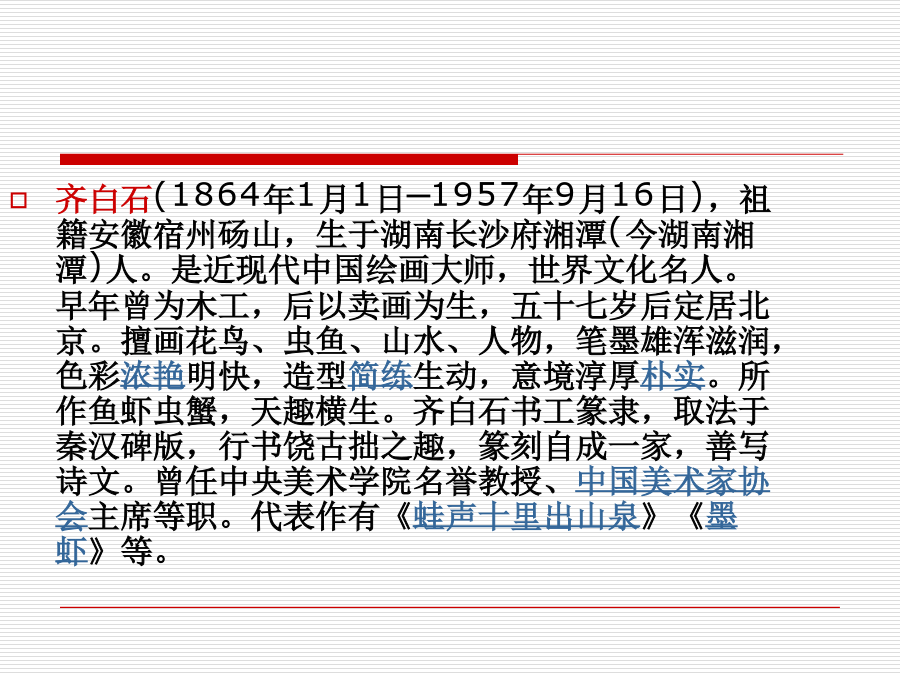 《虾趣》赏析齐白石(1864-1957),名璜,字渭清,号兰亭、濒生,别号白石山人,遂以齐白石名行世;并有齐大、木人、木居士、红豆生、星塘老屋后人、借山翁、借山吟馆主者、寄园、萍翁、寄萍堂主人、龙山社长、三百石印富翁、百树梨花主人等大量笔名与自号。湖南湘潭人,二十世纪中国画艺术大师,他是一个放牛娃和木匠出身的大画家,一生俭朴,时时不忘农村生活,对鱼虾、花鸟、竹子等孩童时农村生活常见物特别有感情,并且这些都成为他画画的题材,反应在作品上都显得生气盎然,特别是鱼虾,达到出神入化的地步。白石画虾已入化境,在简括