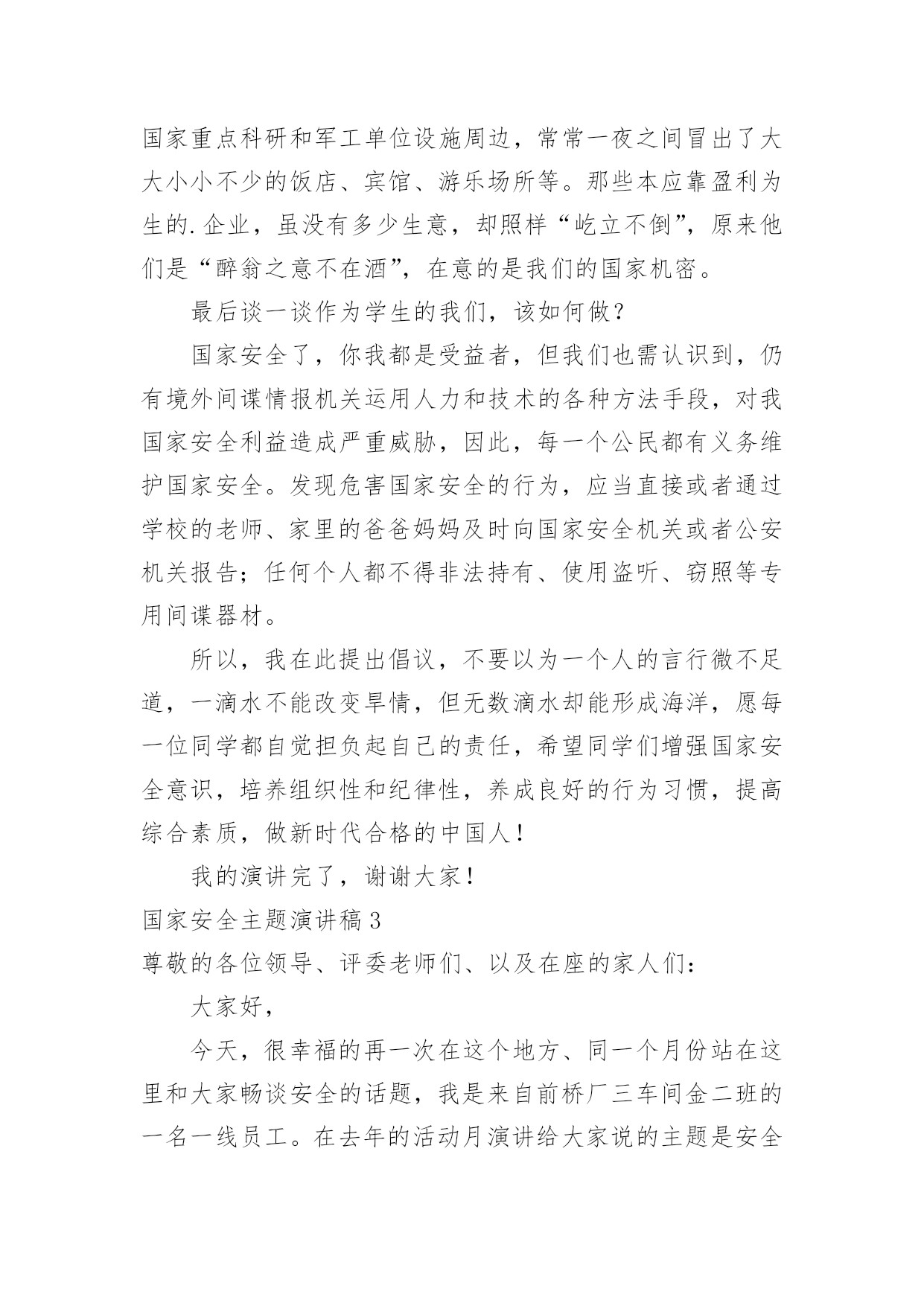 国家安全主题演讲稿国家安全主题演讲稿演讲稿以发表意见,表达观点为主,是为演讲而事先准备好的文稿。在充满活力,日益开放的今天,用到演讲稿的地方越来越多,写起演讲稿来就毫无头绪?以下是小编为大家收集的国家安全主题演讲稿,仅供参考,希望能够帮助到大家。国家安全主题演讲稿1同学们,老师们:大家早上好!今年的4月15日是第x个全民国家安全教育日。今天我国旗下演讲的主题是:“提高国家安全意识,增强国家安全责任”。首先来说说什么是国家安全?国家安全是指主权国家独立自主的生存和发展的权利和利益的总和,指国家独立、主权和领
