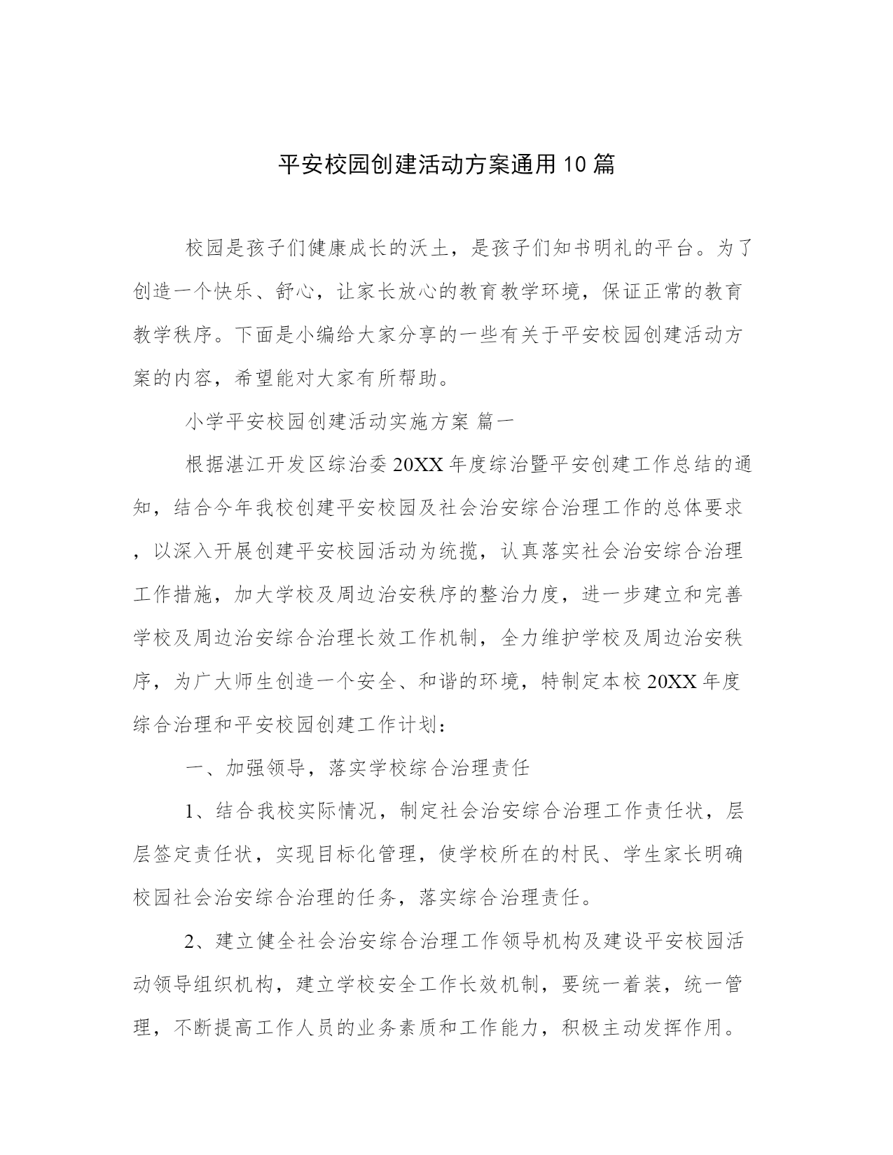 平安校园创建活动方案通用10篇根据湛江开发区综治委《20XX年度综治暨平安创建工作总结的通知》,结合今年我校创建平安校园及社会治安综合治理工作的总体要求,以深入开展创建平安校园活动为统揽,认真落实社会治安综合治理工作措施,加大学校及周边治安秩序的整治力度,进一步建立和完善学校及周边治安综合治理长效工作机制,全力维护学校及周边治安秩序,为广大师生创造一个安全、和谐的环境,特制定本校20XX年度综合治理和平安校园创建工作计划:一、加强领导,落实学校综合治理责任1、结合我校实际情况,制定《社会治安综合治理工作责