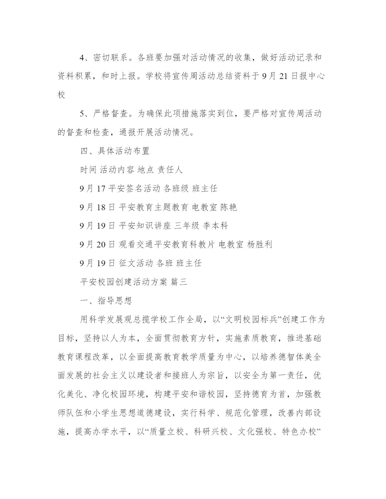 平安校园创建活动方案平安校园创建活动方案为了确保事情或工作得以顺利进行,往往需要预先进行方案制定工作,方案可以对一个行动明确一个大概的方向。那么优秀的方案是什么样的呢?下面是小编整理的平安校园创建活动方案,欢迎阅读与收藏。平安校园创建活动方案1一、指导思想为认真落实科学发展观,坚持以人为本,紧密结合学校实际,扎实开展“平安校园”建设,确保广大师生的生命和财产安全,确保正常的教学秩序,确保学校的稳定,为学校的改革发展创造良好的环境,为建设“平安校园”作出贡献。二、工作重点(一)广泛宣传,增强师生安全意识。开