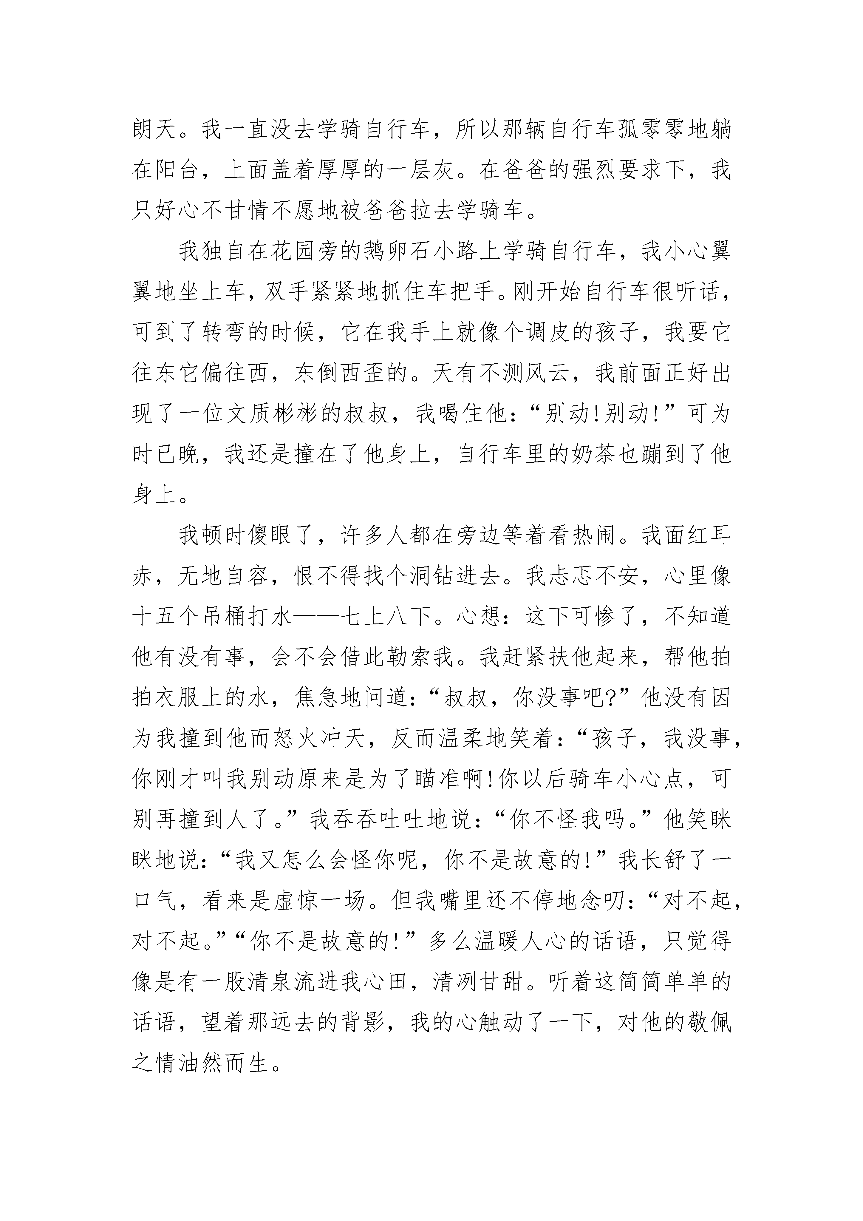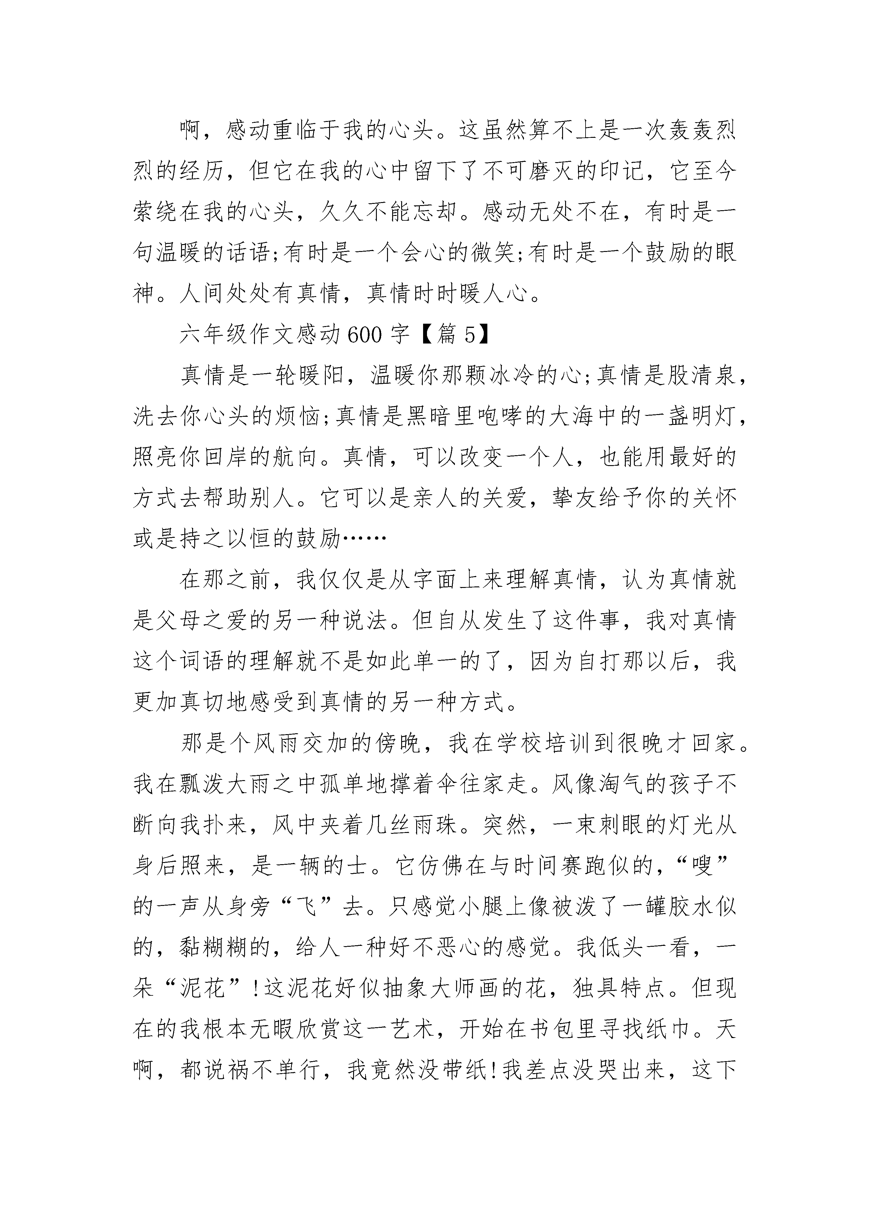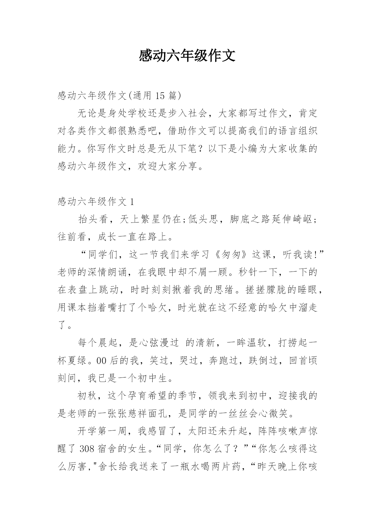 感动六年级作文感动六年级作文(通用15篇)无论是身处学校还是步入社会,大家都写过作文,肯定对各类作文都很熟悉吧,借助作文可以提高我们的语言组织能力。你写作文时总是无从下笔?以下是小编为大家收集的感动六年级作文,欢迎大家分享。感动六年级作文1抬头看,天上繁星仍在;低头思,脚底之路延伸崎岖;往前看,成长一直在路上。“同学们,这一节我们来学习《匆匆》这课,听我读!”老师的深情朗诵,在我眼中却不屑一顾。秒针一下,一下的在表盘上跳动,时时刻刻揪着我的思绪。搓搓朦胧的睡眼,用课本挡着嘴打了个哈欠,时光就在这不经意的哈