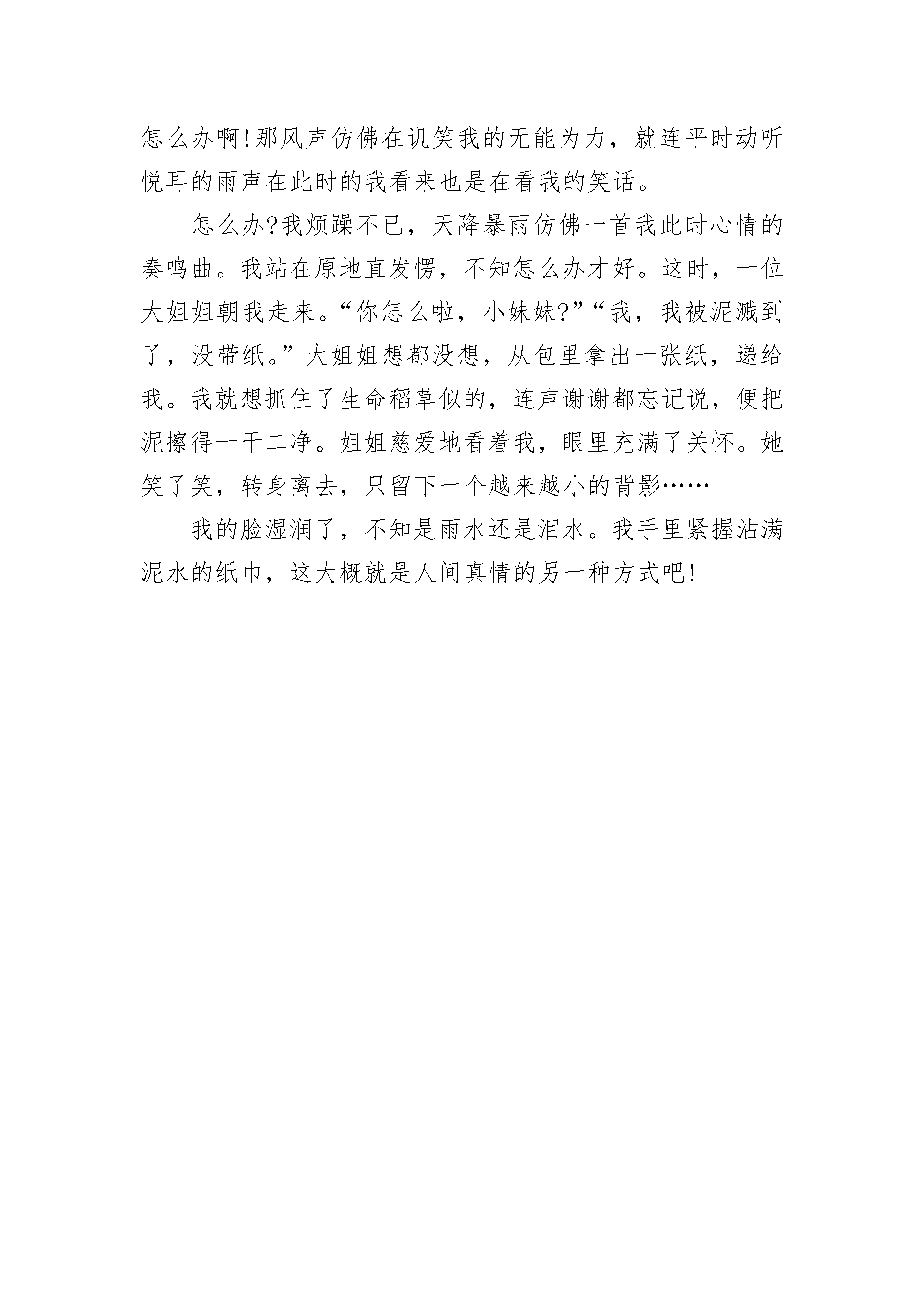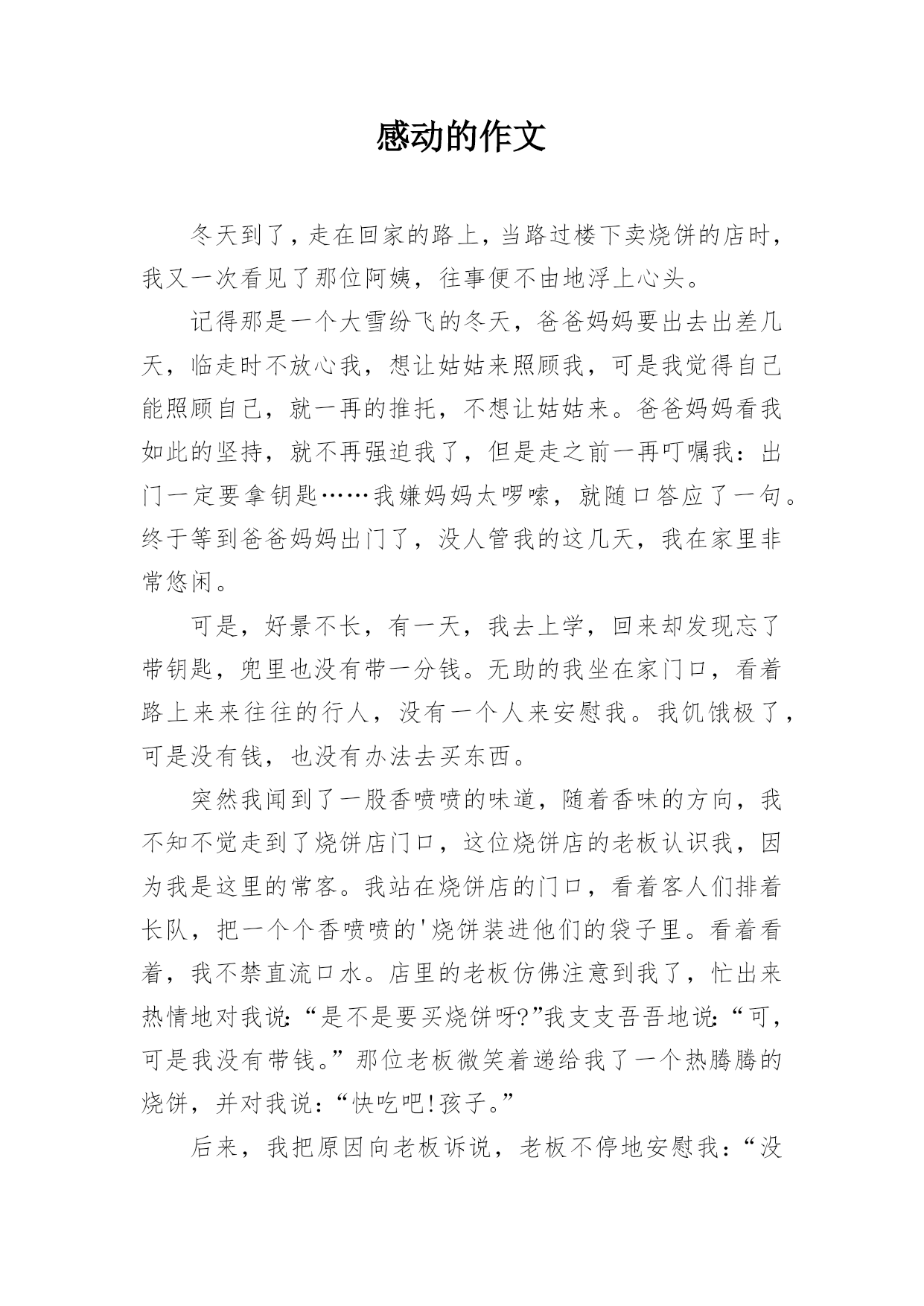 感动的作文冬天到了,走在回家的路上,当路过楼下卖烧饼的店时,我又一次看见了那位阿姨,往事便不由地浮上心头。记得那是一个大雪纷飞的冬天,爸爸妈妈要出去出差几天,临走时不放心我,想让姑姑来照顾我,可是我觉得自己能照顾自己,就一再的推托,不想让姑姑来。爸爸妈妈看我如此的坚持,就不再强迫我了,但是走之前一再叮嘱我:出门一定要拿钥匙……我嫌妈妈太啰嗦,就随口答应了一句。终于等到爸爸妈妈出门了,没人管我的这几天,我在家里非常悠闲。可是,好景不长,有一天,我去上学,回来却发现忘了带钥匙,兜里也没有带一分钱。无助的我坐在