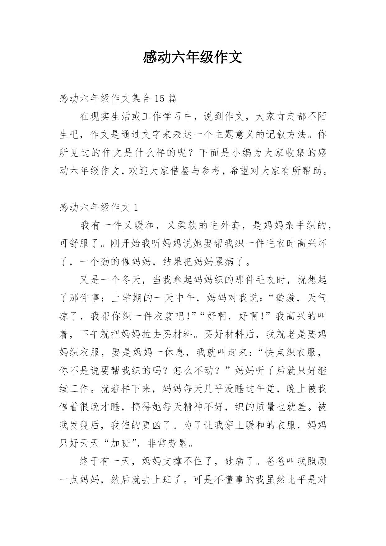 感动六年级作文感动六年级作文集合15篇在现实生活或工作学习中,说到作文,大家肯定都不陌生吧,作文是通过文字来表达一个主题意义的记叙方法。你所见过的作文是什么样的呢?下面是小编为大家收集的感动六年级作文,欢迎大家借鉴与参考,希望对大家有所帮助。感动六年级作文1我有一件又暖和,又柔软的毛外套,是妈妈亲手织的,可舒服了。刚开始我听妈妈说她要帮我织一件毛衣时高兴坏了,一个劲的催妈妈,结果把妈妈累病了。又是一个冬天,当我拿起妈妈织的那件毛衣时,就想起了那件事:上学期的一天中午,妈妈对我说:“璇璇,天气凉了,我帮你织