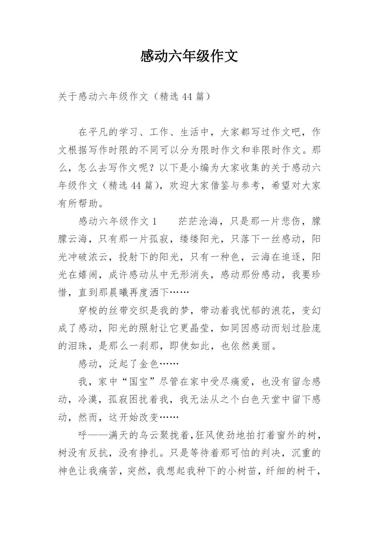 感动六年级作文关于感动六年级作文(精选44篇)在平凡的学习、工作、生活中,大家都写过作文吧,作文根据写作时限的不同可以分为限时作文和非限时作文。那么,怎么去写作文呢?以下是小编为大家收集的关于感动六年级作文(精选44篇),欢迎大家借鉴与参考,希望对大家有所帮助。感动六年级作文1茫茫沧海,只是那一片悲伤,朦朦云海,只有那一片孤寂,缕缕阳光,只落下一丝感动,阳光冲破浓云,投射下的阳光,只有一种色,云海在追逐,阳光在嬉闹,成许感动从中无形消失,感动那份感动,我要珍惜,直到那晨曦再度洒下……穿梭的丝带交织是我的梦