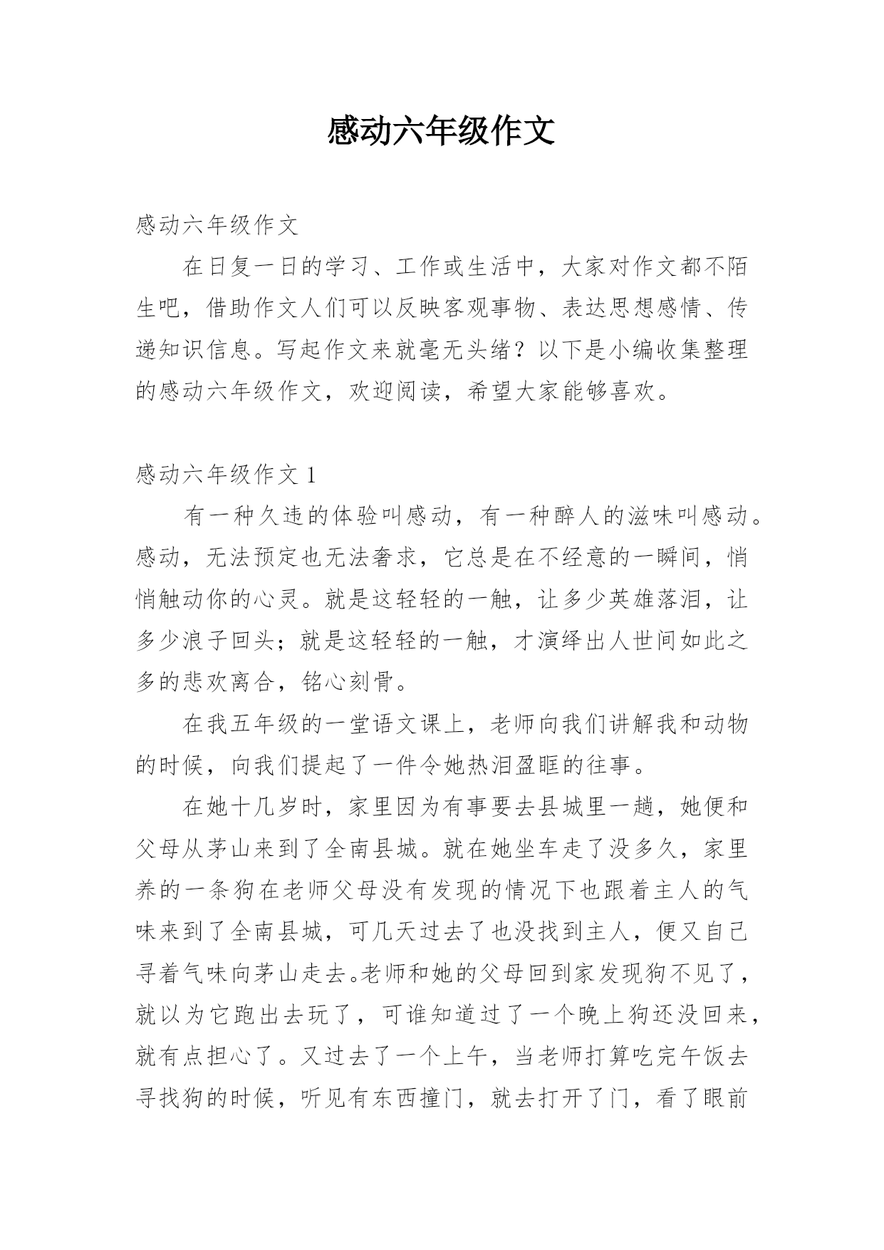 感动六年级作文感动六年级作文在日复一日的学习、工作或生活中,大家对作文都不陌生吧,借助作文人们可以反映客观事物、表达思想感情、传递知识信息。写起作文来就毫无头绪?以下是小编收集整理的感动六年级作文,欢迎阅读,希望大家能够喜欢。感动六年级作文1有一种久违的体验叫感动,有一种醉人的滋味叫感动。感动,无法预定也无法奢求,它总是在不经意的一瞬间,悄悄触动你的心灵。就是这轻轻的一触,让多少英雄落泪,让多少浪子回头;就是这轻轻的一触,才演绎出人世间如此之多的悲欢离合,铭心刻骨。在我五年级的一堂语文课上,老师向我们讲解