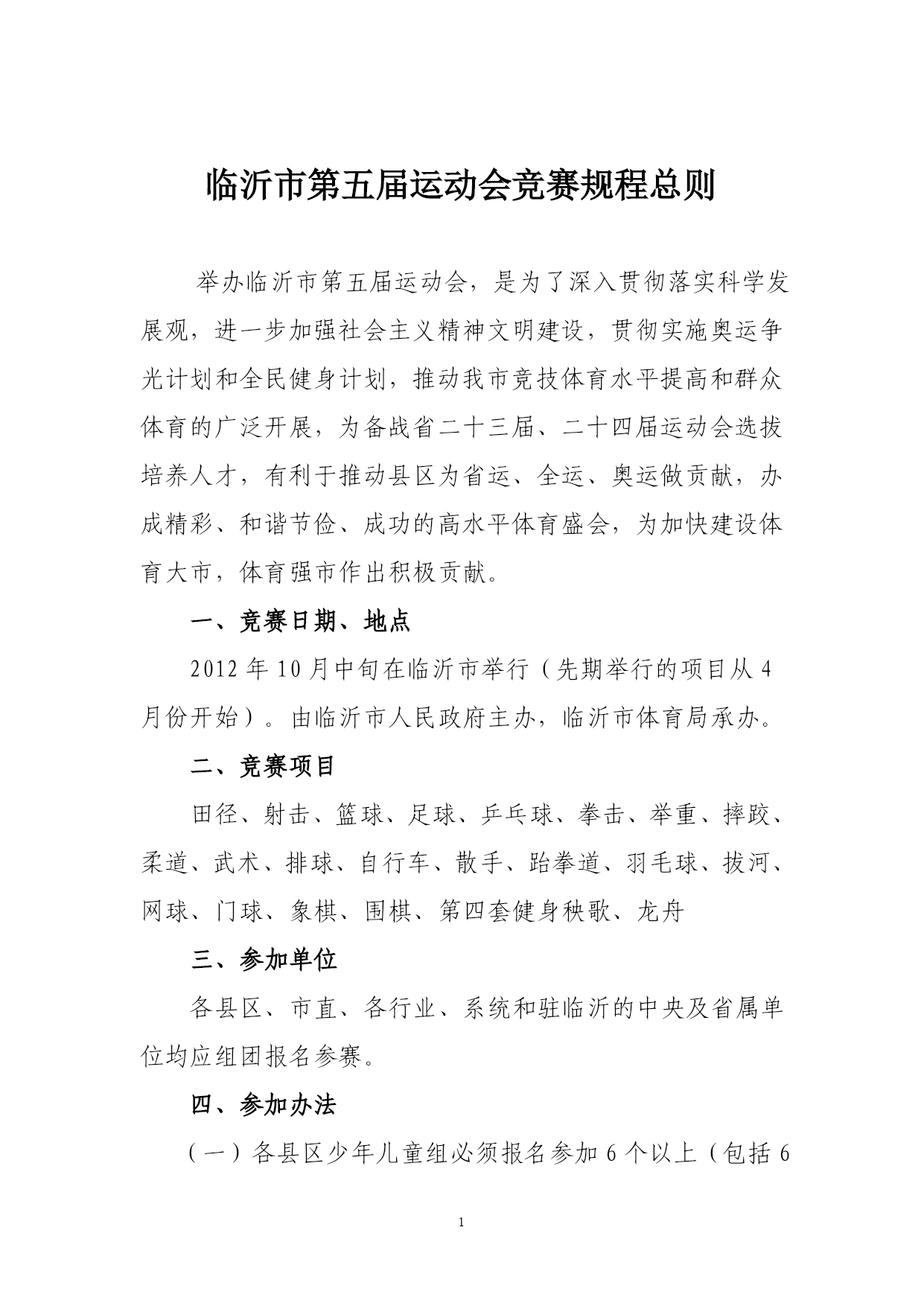 临沂市第五届运动会竞赛规程总则举办临沂市第五届运动会,是为了深入贯彻落实科学发展观,进一步加强社会主义精神文明建设,贯彻实施奥运争光计划和全民健身计划,推动我市竞技体育水平提高和群众体育的广泛开展,为备战省二十三届、二十四届运动会选拔培养人才,有利于推动县区为省运、全运、奥运做贡献,办成精彩、和谐节俭、成功的高水平体育盛会,为加快建设体育大市,体育强市作出积极贡献。一、竞赛日期、地点2012年10月中旬在临沂市举行(先期举行的项目从4月份开始)。由临沂市人民政府主办,临沂市体育局承办。二、
