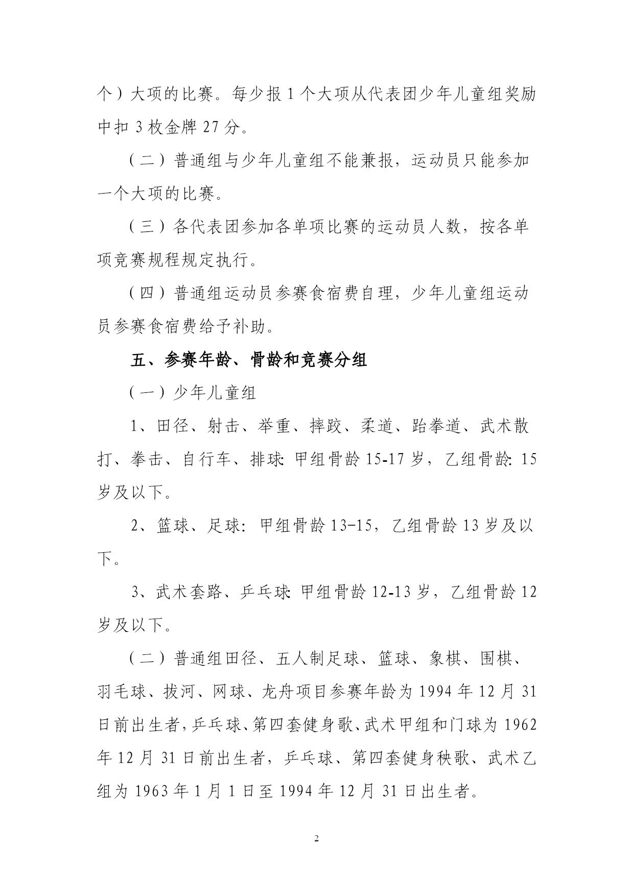 PAGE-16-PAGE-4-淮南市首届青少年阳光体育运动会总规程一、竞赛日期2015年5月-11月二、竞赛地点详见各单项竞赛规程三、竞赛项目(一)高中部:田径、篮球、足球、乒乓球、中国象棋、围棋、广播体操、啦啦操(8项)(二)初中部:田径、篮球、足球、乒乓球、中国象棋、围棋、跳绳、跆拳道、武术套路、啦啦操(10项)(三)小学部:田径、篮球、足球、乒乓球、中国象棋、围棋、跳绳、跆拳道、武术套路、啦啦操(10项)四、参加单位市属各中小学,区属各中小学及中专学校、民办学校以校为单位组队参赛。五、参
