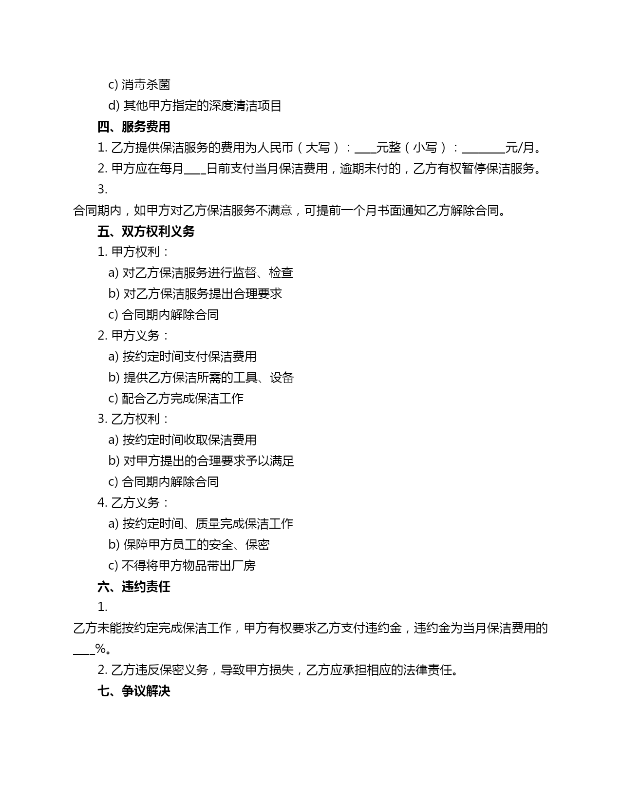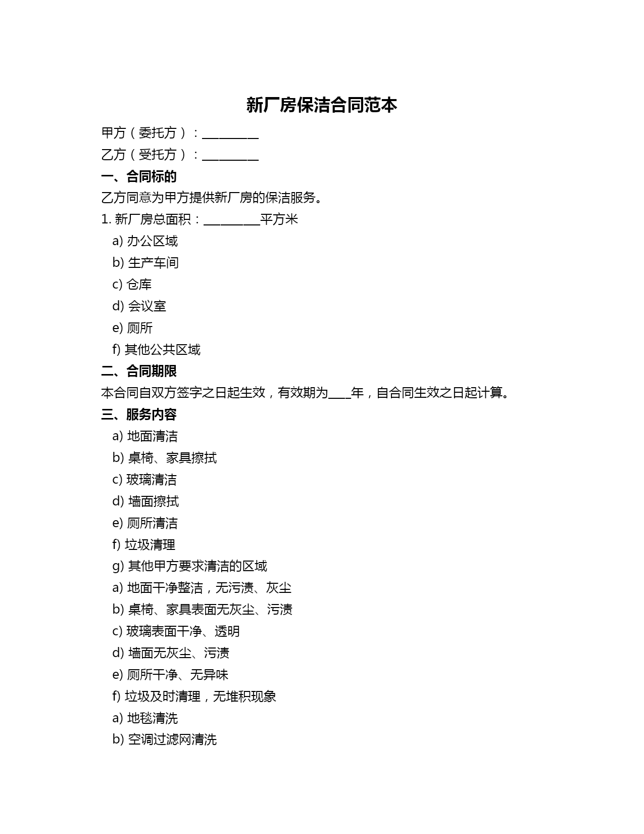 新厂房保洁合同范本甲方(委托方):__________乙方(受托方):__________一、合同标的乙方同意为甲方提供新厂房的保洁服务。1.新厂房总面积:__________平方米a)办公区域b)生产车间c)仓库d)会议室e)厕所f)其他公共区域二、合同期限本合同自双方签字之日起生效,有效期为____年,自合同生效之日起计算。三、服务内容a)地面清洁b)桌椅、家具擦拭c)玻璃清洁d)墙面擦拭e)厕所清洁f)垃圾清理g)其他甲方要求清洁的区域a)地面干净整洁,无污渍、灰尘b)桌椅、家具表面无灰尘、污渍c)