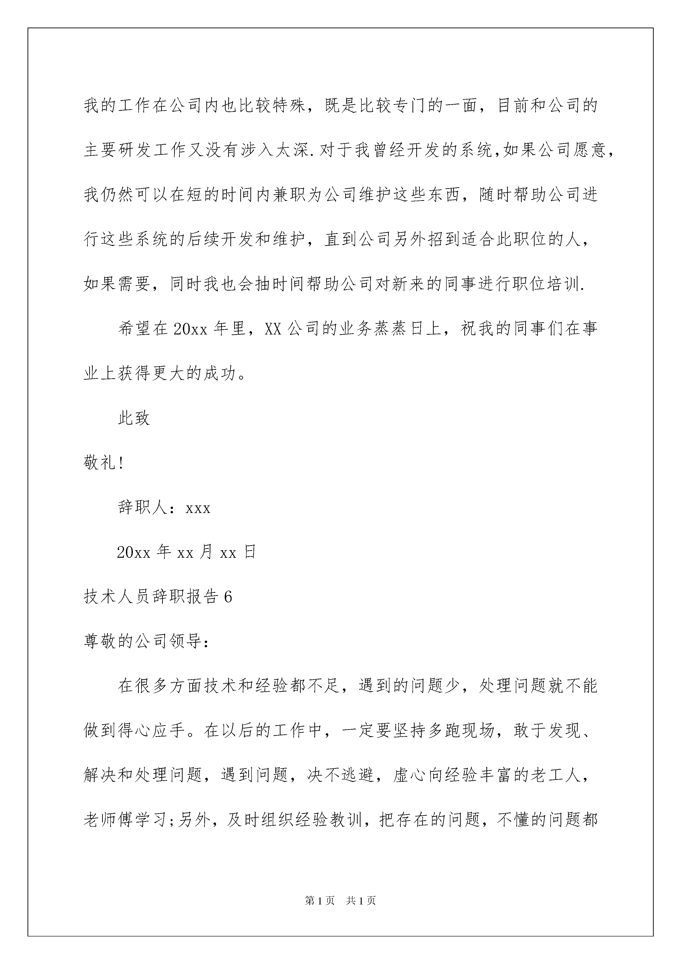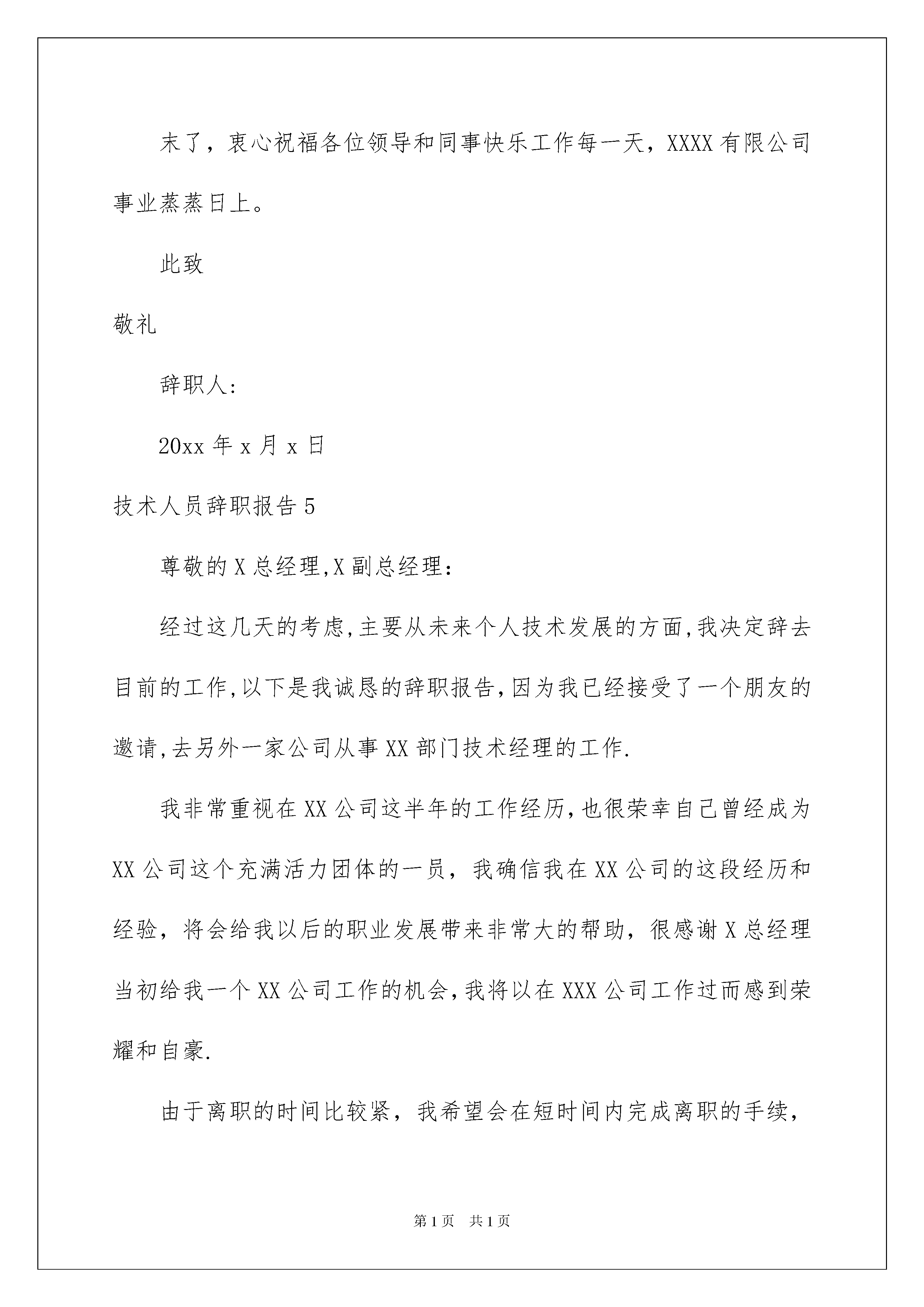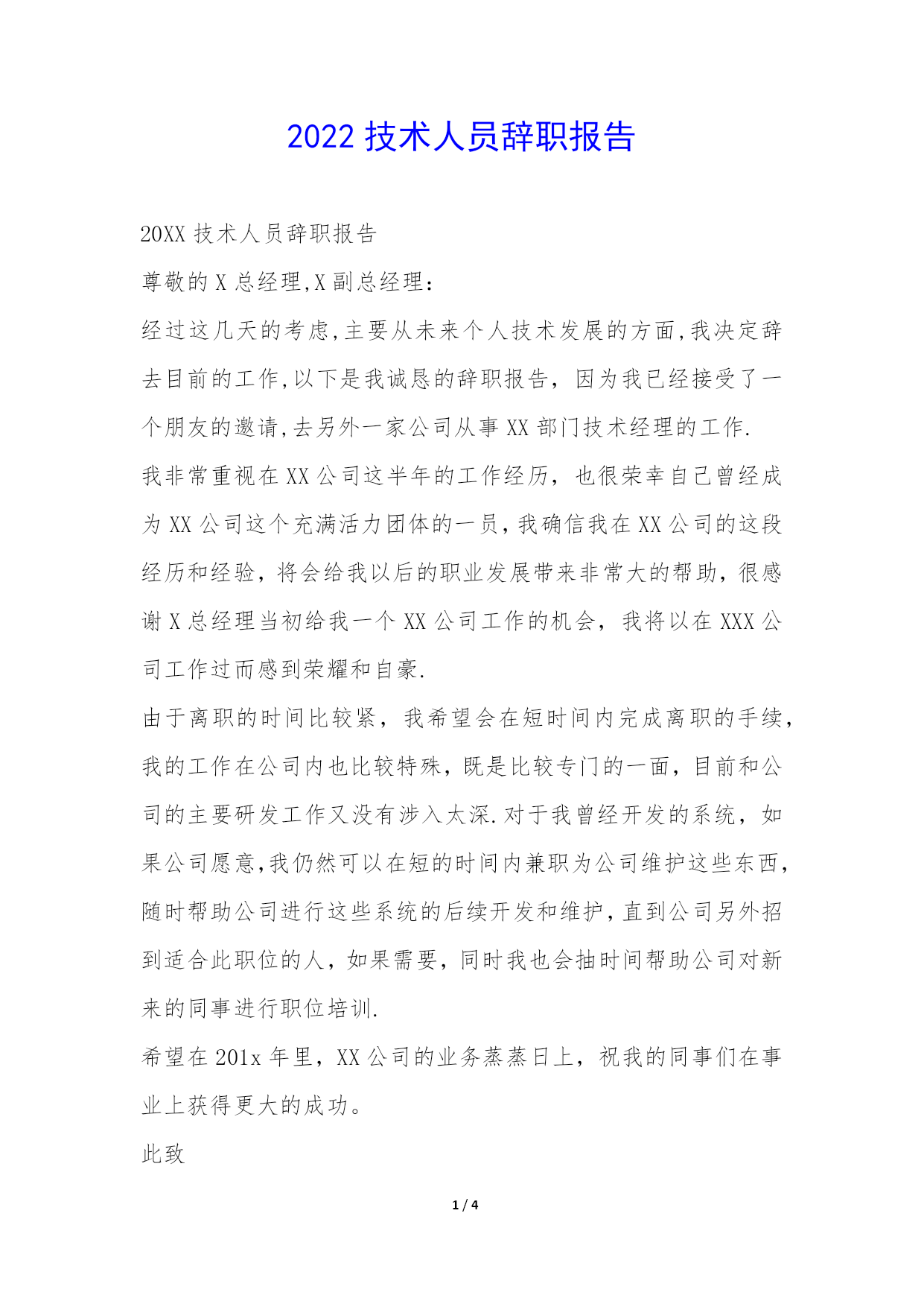 /NUMPAGES42022技术人员辞职报告20XX技术人员辞职报告尊敬的X总经理,X副总经理:经过这几天的考虑,主要从未来个人技术发展的方面,我决定辞去目前的工作,以下是我诚恳的辞职报告,因为我已经接受了一个朋友的邀请,去另外一家公司从事XX部门技术经理的工作.我非常重视在XX公司这半年的工作经历,也很荣幸自己曾经成为XX公司这个充满活力团体的一员,我确信我在XX公司的这段经历和经验,将会给我以后的职业发展带来非常大的帮助,很感谢X总经理当初给我一个XX公司工作的机会,我将以在XX