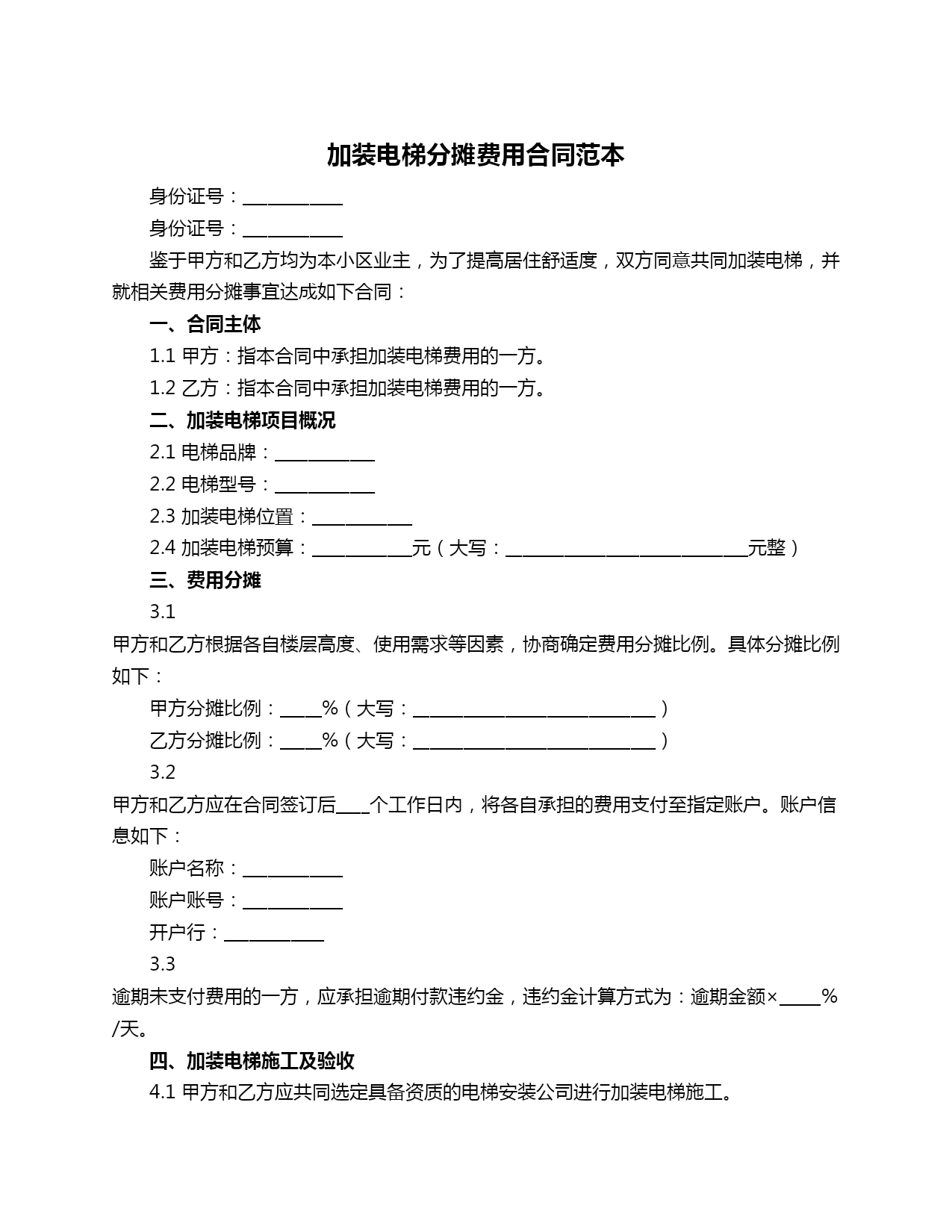 加装电梯分摊费用合同范本身份证号:____________身份证号:____________鉴于甲方和乙方均为本小区业主,为了提高居住舒适度,双方同意共同加装电梯,并就相关费用分摊事宜达成如下合同:一、合同主体1.1甲方:指本合同中承担加装电梯费用的一方。1.2乙方:指本合同中承担加装电梯费用的一方。二、加装电梯项目概况2.1电梯品牌:____________2.2电梯型号:____________2.3加装电梯位置:____________2.4加装电梯预算:____________元(大写:_____