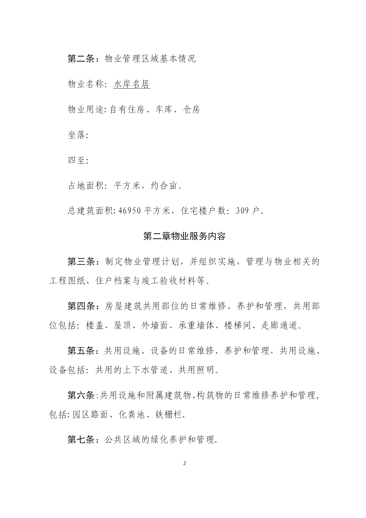 。-可编辑修改-合同编号:号物业服务合同物业名称:水岸名居小区物业公司:福州星之辉物业管理有限公司二○一八年一月十日物业服务合同第一章总则第一条:本合同当事人委托方(以下简称甲方)名称:水岸名居受委托方(以下简称乙方):名称:福州星之辉物业管理有限公司物业管理资质等级证书编号:三级根据有关法律、法规,在自愿、平等、协商一致的基础上,甲方选聘(或续聘)乙方为福州星之辉物业管理有限公司(物业名称)提供物业管理服务,订立本合同。第二条:物业管理区域基本情况物业名称:水岸名居物业用途:自有住房、车库、仓房坐落:四