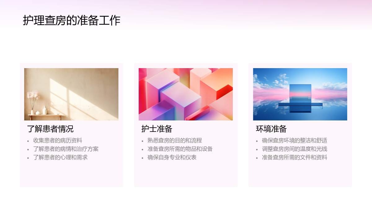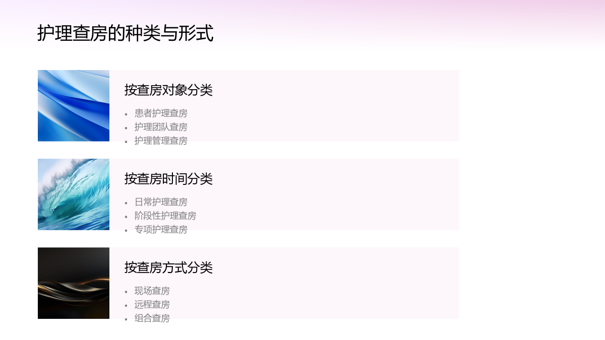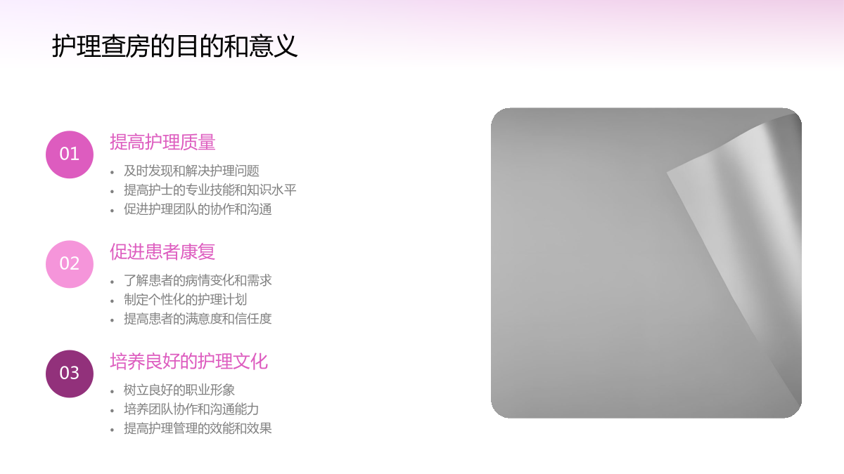 护理查房包括哪些内容01护理查房的流程0203040506护理查房的潜在问题与风险070809010护理查房的公众认知011012013014护理查房的工作流程比较