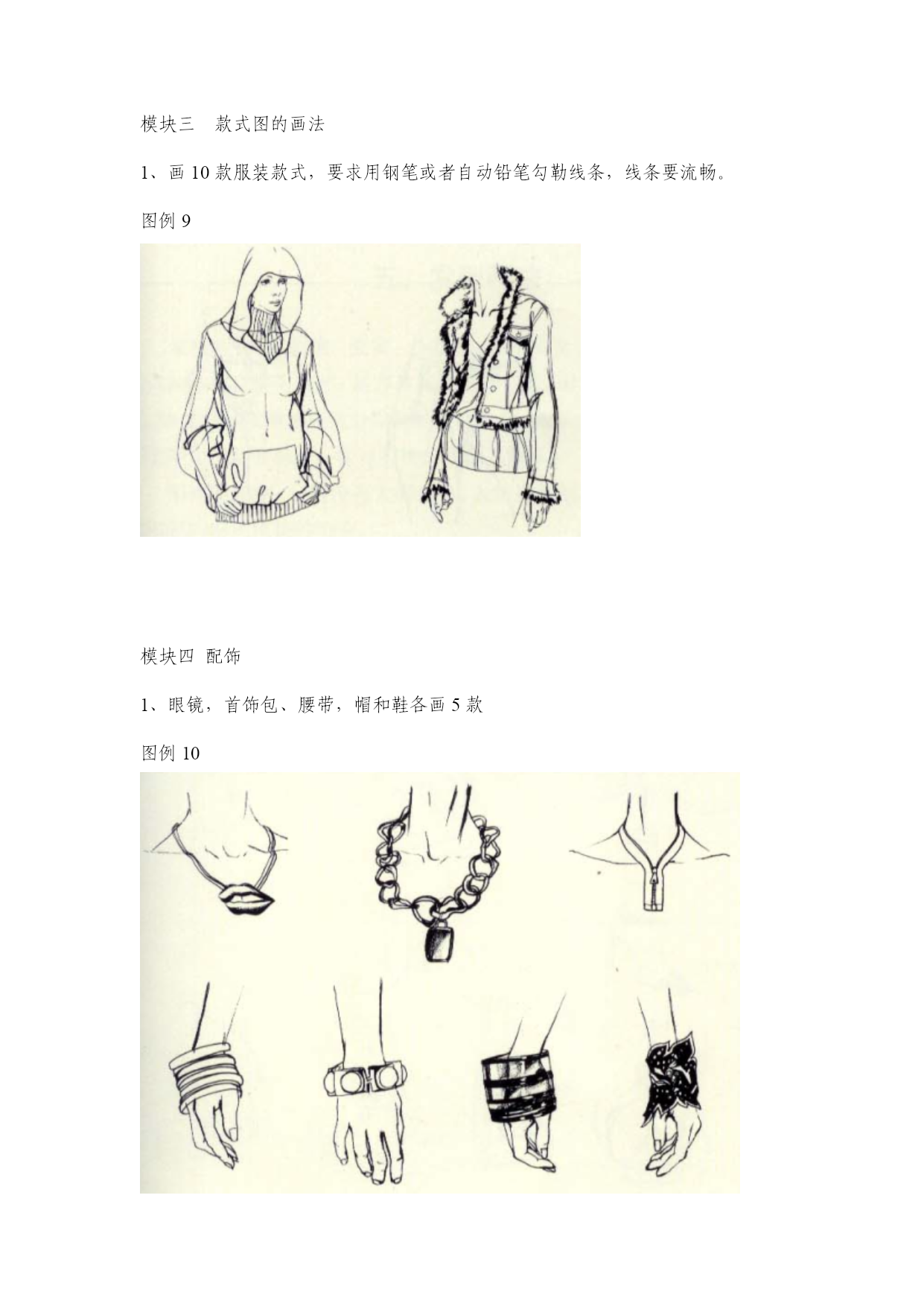 模块三款式图的画法1、画10款服装款式,要求用钢笔或者自动铅笔勾勒线条,线条要流畅。图例9模块四配饰1、眼镜,首饰包、腰带,帽和鞋各画5款图例10图例11图例12模块五效果图技法之面料的表现皮革的临摹与默写,注意笔触间的渲染。图例13毛皮的临摹与默写,注意因此色调微妙的细线运用举足轻重,利用流畅的线条也是其弹性特制极佳的表现方法丝绸临摹与默写4、薄纱的临摹与默写,注意用水彩渲染更能表现纱柔和和质感.边缘的细节刻画起着画龙点睛的作用。画硬质纱前要区别于质地柔软的纱。图例14图例155、临摹方格呢,并且自己选