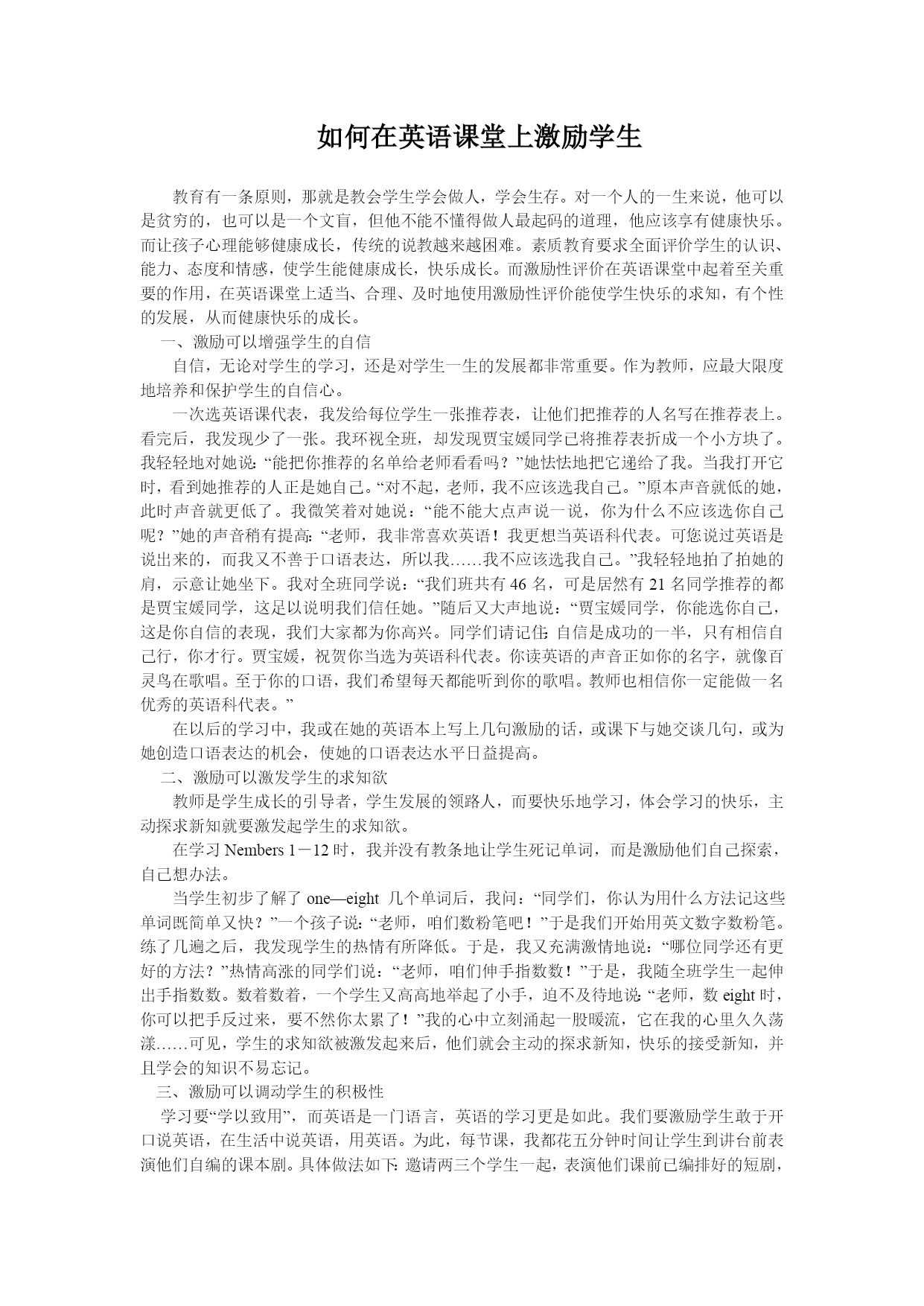 如何在英语课堂上激励学生教育有一条原则,那就是教会学生学会做人,学会生存。对一个人的一生来说,他可以是贫穷的,也可以是一个文盲,但他不能不懂得做人最起码的道理,他应该享有健康快乐。而让孩子心理能够健康成长,传统的说教越来越困难。素质教育要求全面评价学生的认识、能力、态度和情感,使学生能健康成长,快乐成长。而激励性评价在英语课堂中起着至关重要的作用,在英语课堂上适当、合理、及时地使用激励性评价能使学生快乐的求知,有个性的发展,从而健康快乐的成长。一、激励可以增强学生的自信自信,无论对学生的学习,还是对学生一