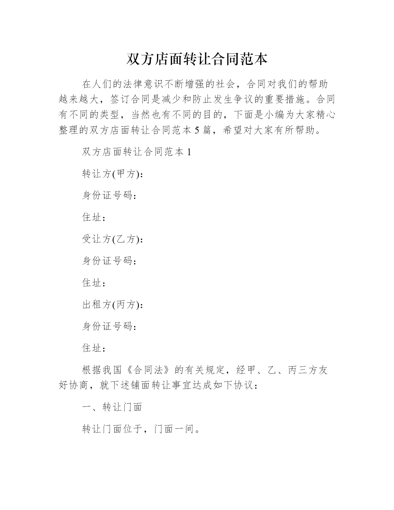 双方店面转让合同范本在人们的法律意识不断增强的社会,合同对我们的帮助越来越大,签订合同是减少和防止发生争议的重要措施。合同有不同的类型,当然也有不同的目的,下面是小编为大家精心整理的双方店面转让合同范本5篇,希望对大家有所帮助。双方店面转让合同范本1转让方(甲方):身份证号码:住址:受让方(乙方):身份证号码:住址:出租方(丙方):身份证号码:住址:根据我国《合同法》的有关规定,经甲、乙、丙三方友好协商,就下述铺面转让事宜达成如下协议:一、转让门面转让门面位于,门面一间。丙方为上述转让门面的所有权人和出租