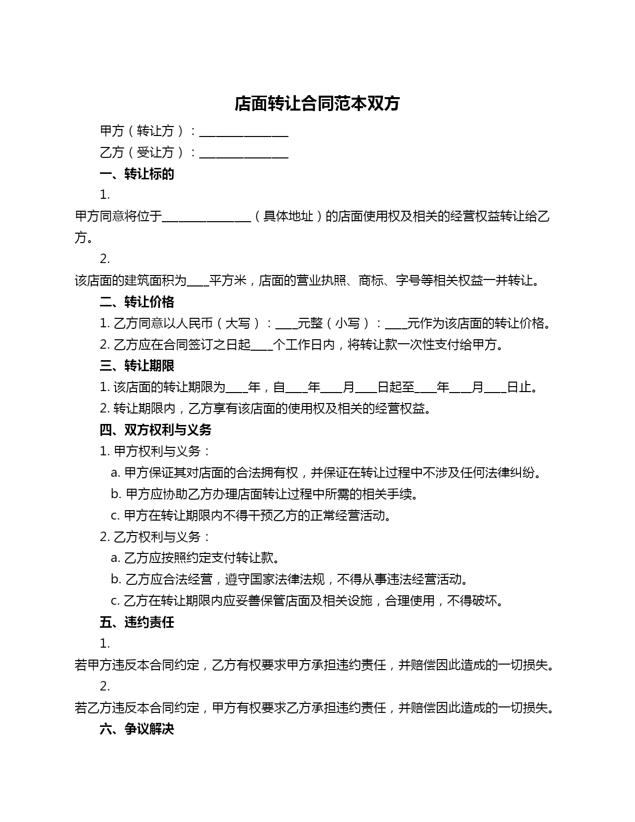 店面双方转让合同范本甲方(转让方):____________________乙方(受让方):____________________一、转让店面基本情况1.1店面名称:____________________1.2店面地址:____________________1.3店面面积:____________________平方米1.4店面用途:____________________1.5店面现状:____________________二、转让价格及支付方式2.1乙方同意以人民币【转让价格】元整(大写:__