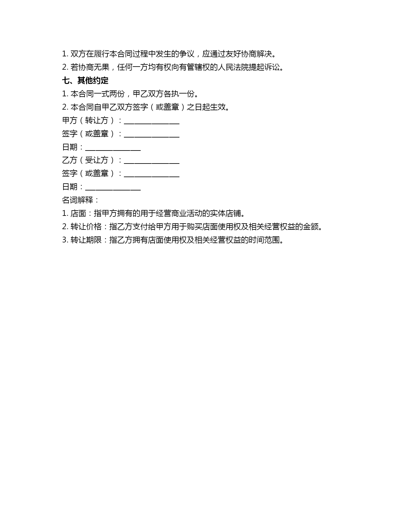 双方店面转让合同双方店面转让合同范本现今社会公众的法律意识不断增强,合同的地位越来越不容忽视,签订合同能够较为有效的约束违约行为。知道吗,写合同可是有方法的哦,下面是小编收集整理的双方店面转让合同范本,希望能够帮助到大家。双方店面转让合同范本1甲方:_________乙方:_________现经甲乙双方友好协商,就灵湖二期吴灵青路北第一栋宾馆旁边的餐厅超市转让一事达成以下协议:一、甲方同意免收三年房租,提供给乙方使用,乙方负责装修;到期后双方协商就市场价格确定房屋租金,如有争议,使用权优先于乙方;若乙方将