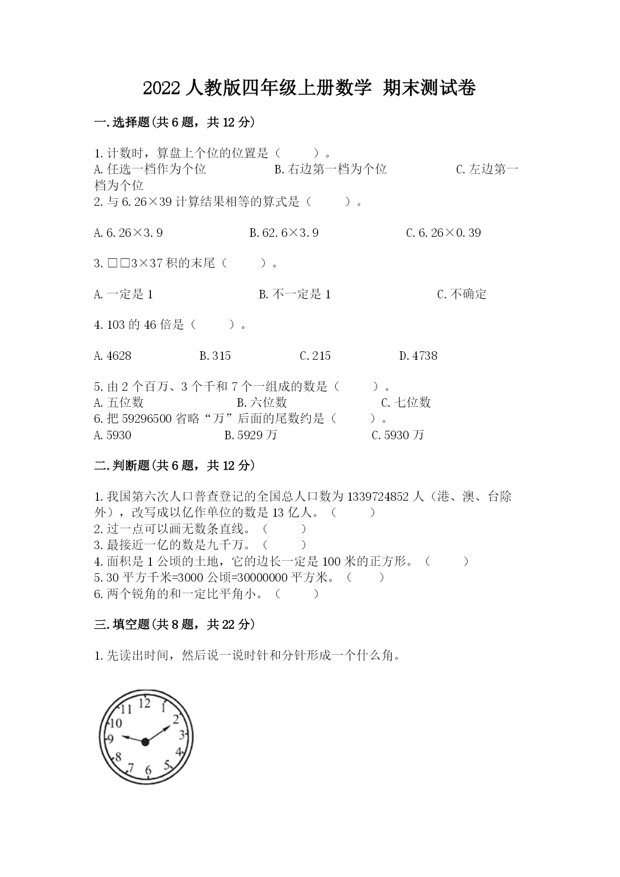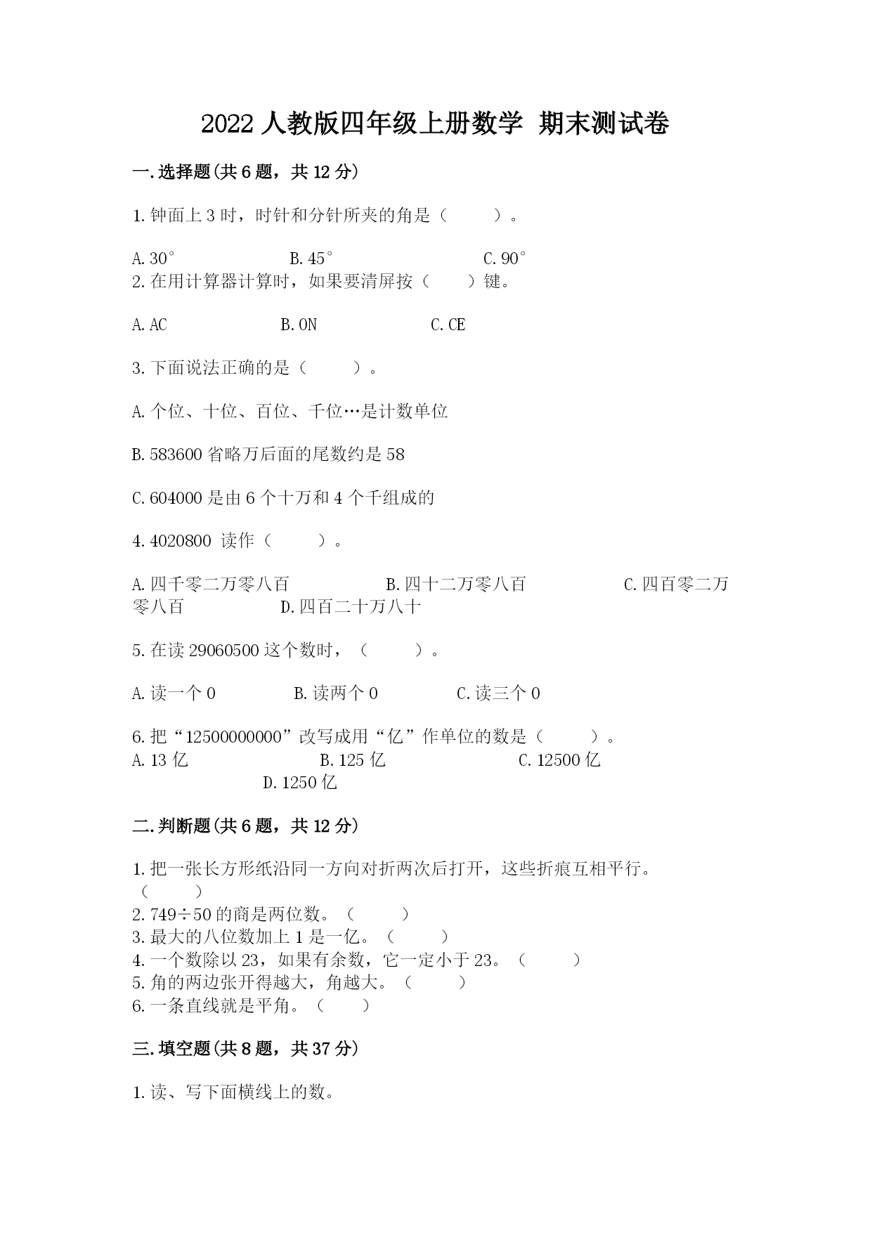 2022人教版四年级上册数学期末测试卷一.选择题(共6题,共12分)1.钟面上3时,时针和分针所夹的角是()。A.30°B.45°C.90°2.在用计算器计算时,如果要清屏按()键。A.ACB.ONC.CE3.下面说法正确的是()。A.个位、十位、百位、千位…是计数单位B.583600省略万后面的尾数约是58C.604000是由6个十万和4个千组成的4.4020800读作()。A.四千零二万零八百B.四十二万零八百C.四百零二万零八百D.四百二十万八十5.在读29060500这个数时,()。A.读一个0B