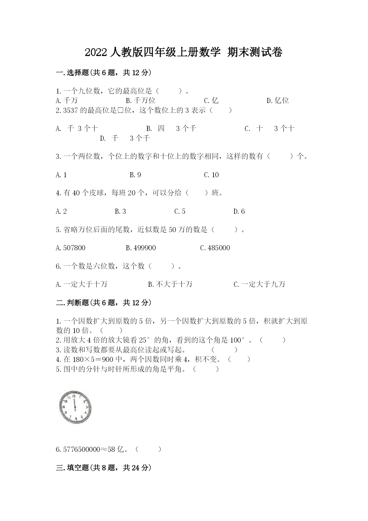 2022人教版四年级上册数学期末测试卷一.选择题(共6题,共14分)1.含有个级、万级和亿级的数,至少是()。A.六位数B.七位数C.八位数D.九位数2.100千克的铁和1吨的棉花相比,()。A.一样重B.100千克的铁多C.1吨的棉花重3.下面各数中,一个“零”也不读的是()。A.350620500B.2360000C.2030600D.2030604.按照我国的计数习惯,从右边起,每()个数位是一级。A.三B.四C.五5.()是计数单位,()是数位。A.亿级B.亿C.亿位6.13时30分,钟面上时针与