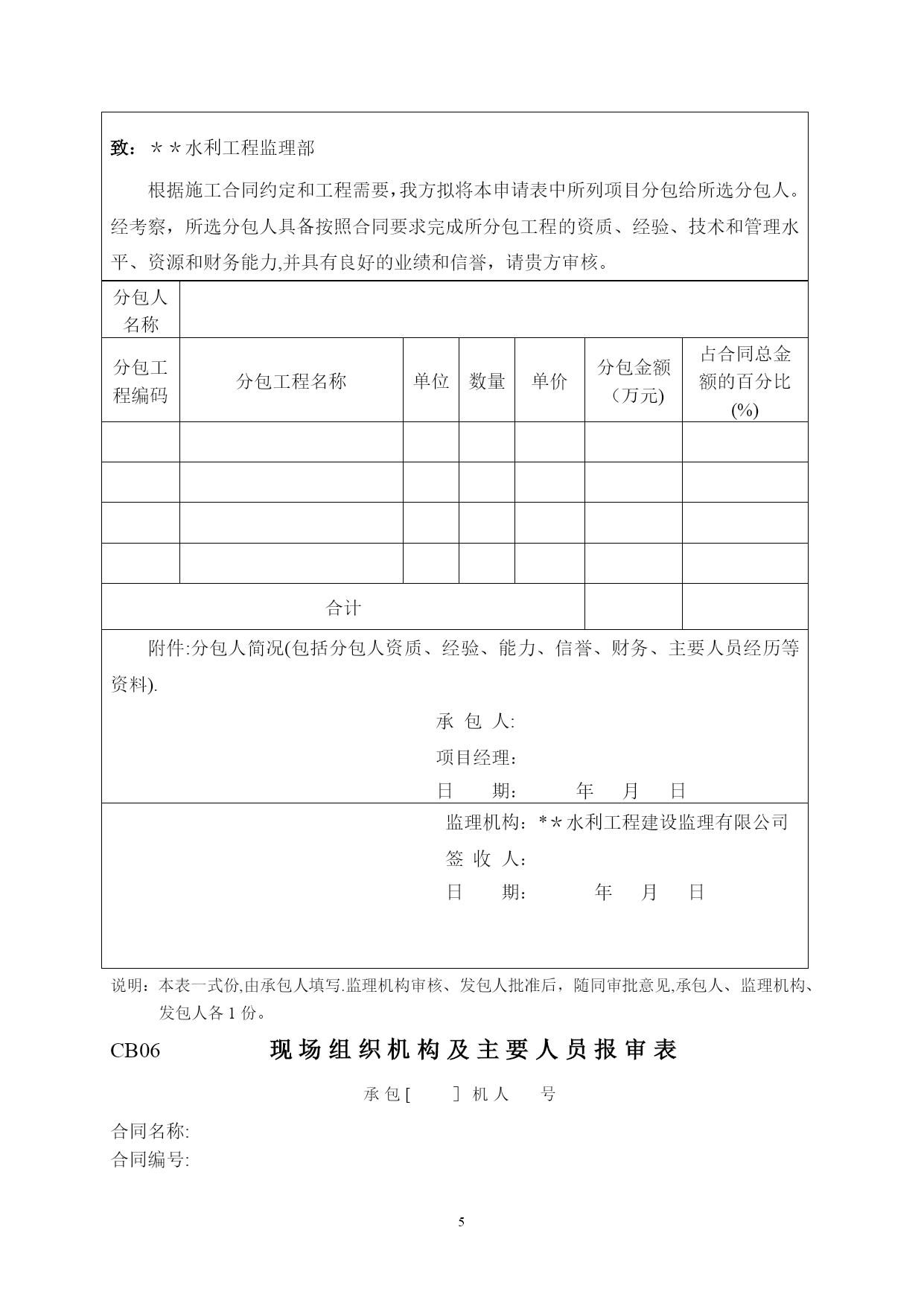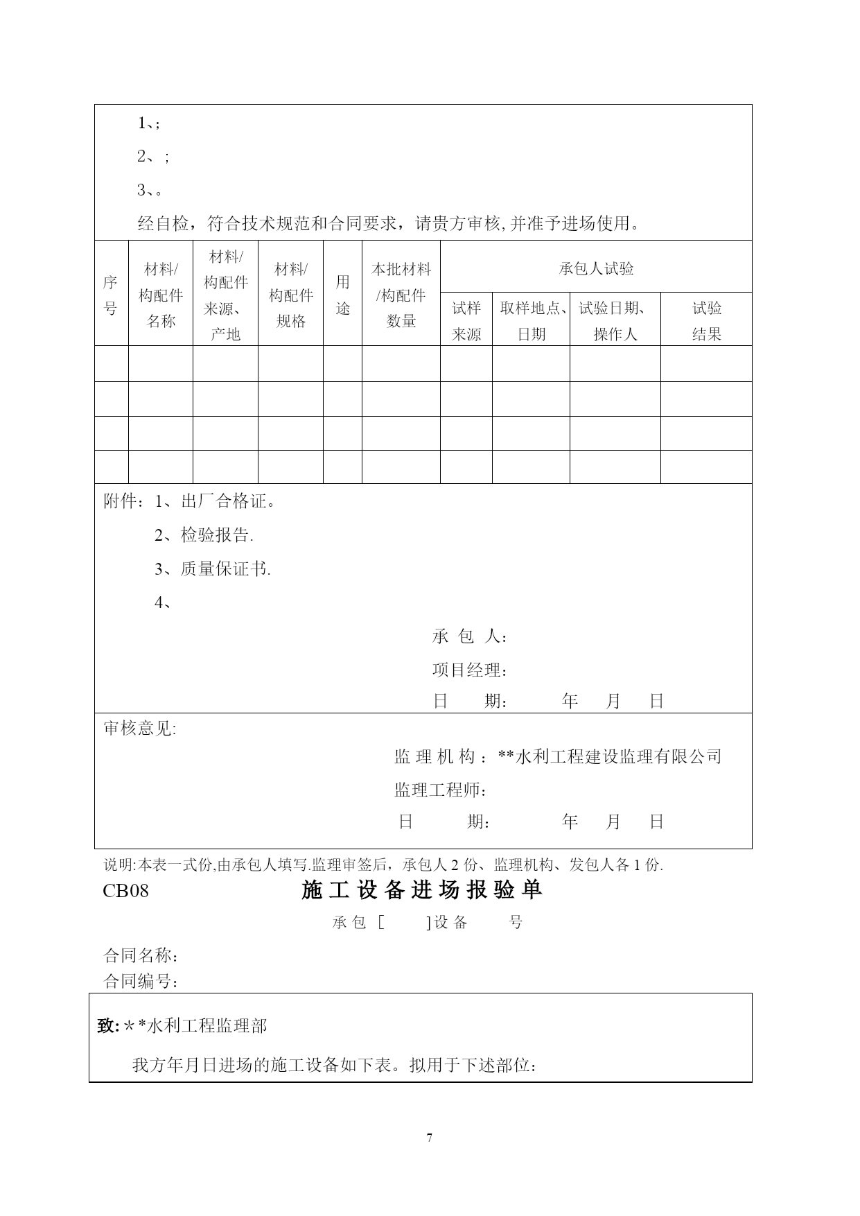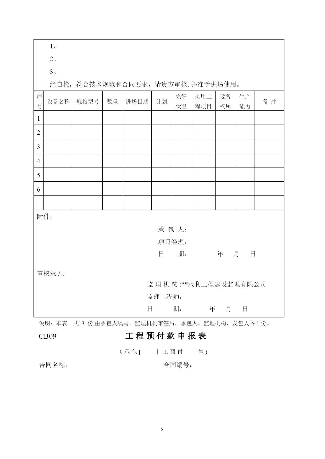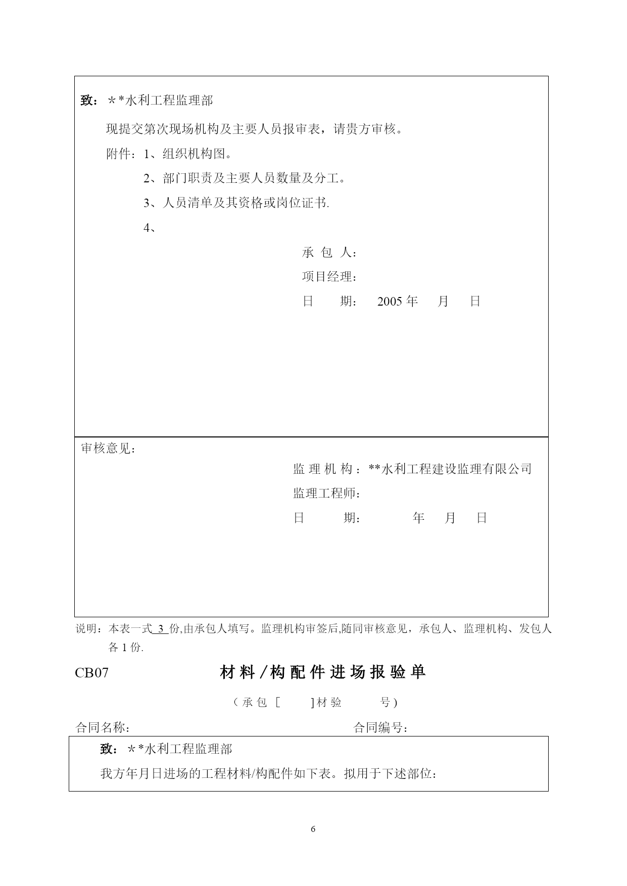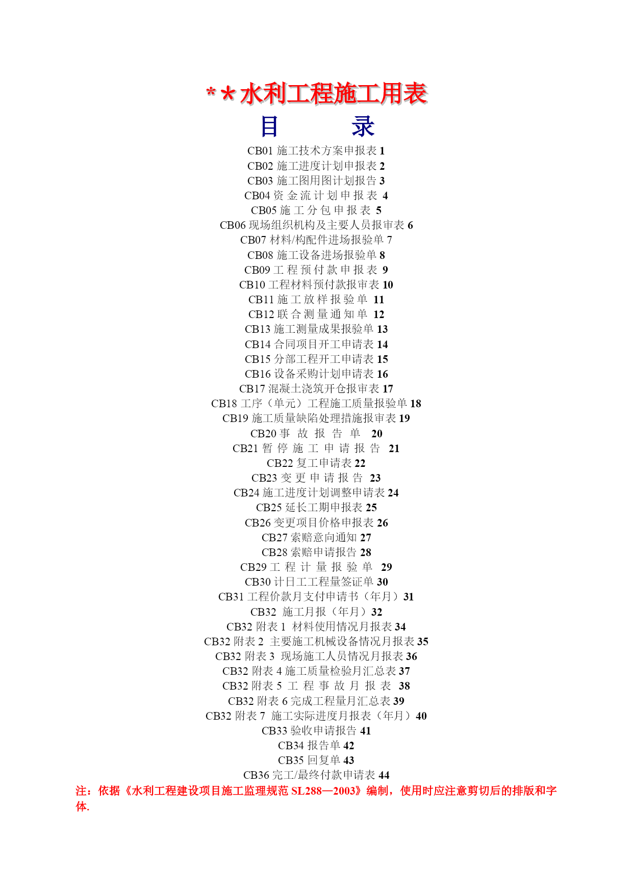 **水利工程施工用表目录TOC\o"1-3"\h\z\uHYPERLINK\l"_Toc74540828"CB01施工技术方案申报表PAGEREF_Toc74540828\h1HYPERLINK\l"_Toc74540829"CB02施工进度计划申报表PAGEREF_Toc74540829\h2HYPERLINK\l"_Toc74540830"CB03施工图用图计划报告PAGEREF_Toc74540830\h3HYPERLINK\