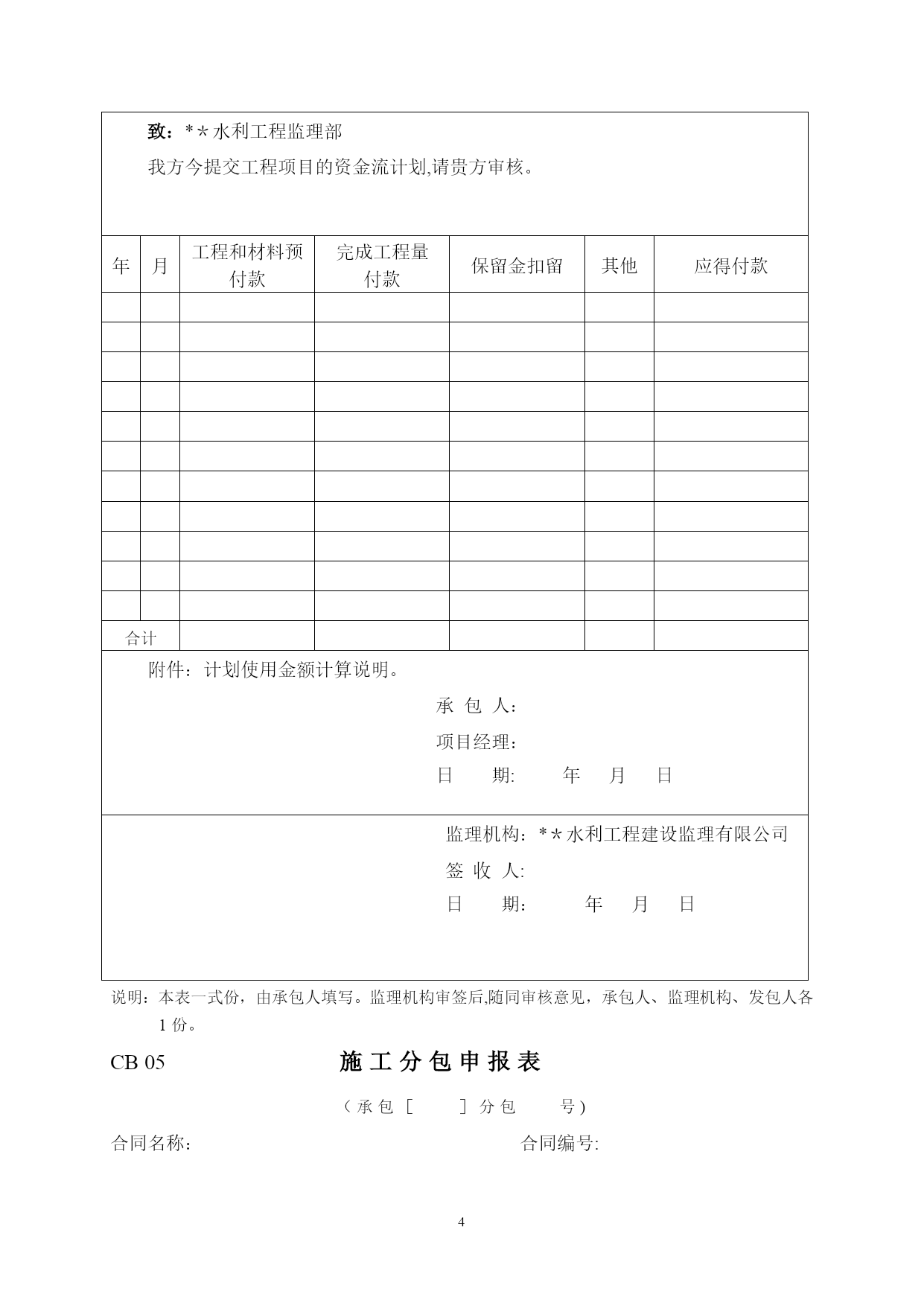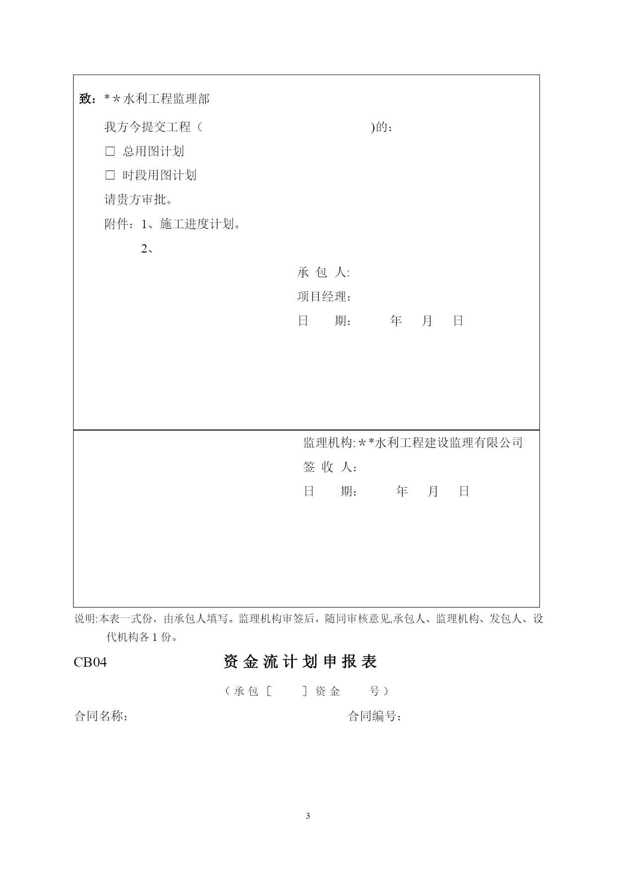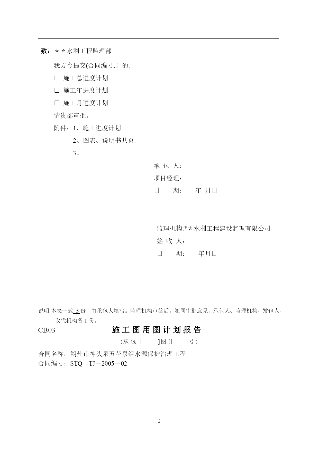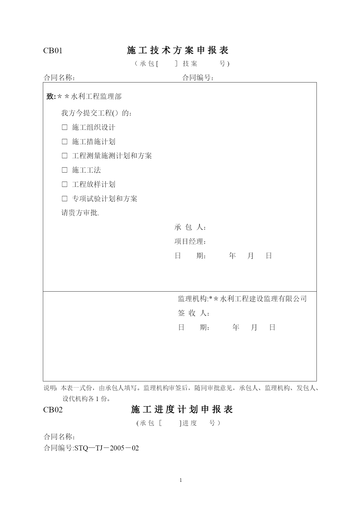 **水利工程施工用表目录TOC\o"1-3"\h\z\uHYPERLINK\l"_Toc74540828"CB01施工技术方案申报表PAGEREF_Toc74540828\h1HYPERLINK\l"_Toc74540829"CB02施工进度计划申报表PAGEREF_Toc74540829\h2HYPERLINK\l"_Toc74540830"CB03施工图用图计划报告PAGEREF_Toc74540830\h3HYPERLINK\l"_Toc74540831"