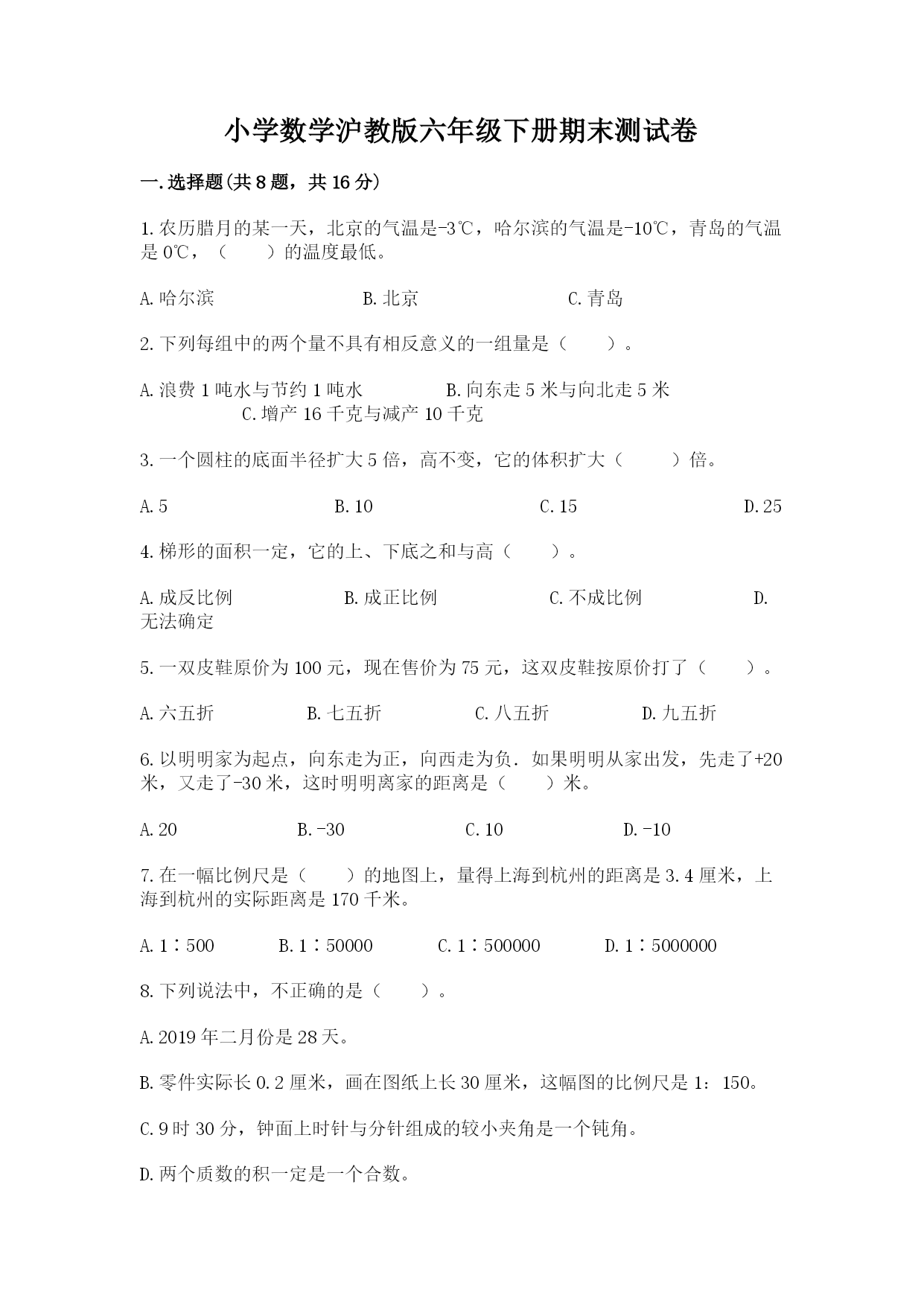 小学数学沪教版六年级下册期末测试卷一.选择题(共8题,共16分)1.农历腊月的某一天,北京的气温是-3℃,哈尔滨的气温是-10℃,青岛的气温是0℃,()的温度最低。A.哈尔滨B.北京C.青岛2.下列每组中的两个量不具有相反意义的一组量是()。A.浪费1吨水与节约1吨水B.向东走5米与向北走5米C.增产16千克与减产10千克3.一个圆柱的底面半径扩大5倍,高不变,它的体积扩大()倍。A.5B.10C.15D.254.梯形的面积一定,它的上、下底之和与高()。A.成反比例B.成正比例C.不成比例D.无法确定5