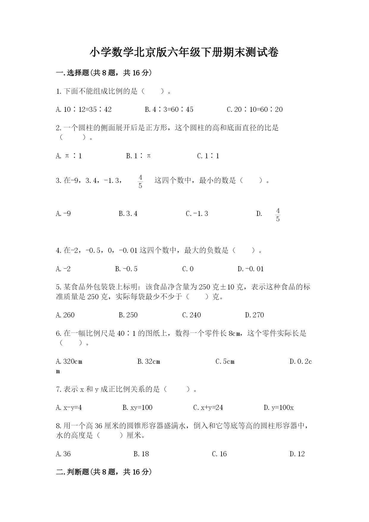 小学数学北京版六年级下册期末测试卷一.选择题(共8题,共16分)1.下面不能组成比例的是()。A.10∶12=35∶42B.4∶3=60∶45C.20∶10=60∶202.一个圆柱的侧面展开后是正方形,这个圆柱的高和底面直径的比是()。A.π∶1B.1∶πC.1∶13.在-9,3.4,-1.3,这四个数中,最小的数是()。A.-9B.3.4C.-1.3D.4.在-2,-0.5,0,-0.01这四个数中,最大的负数是()。A.-2B.-0.5C.0D.-0.015.某食品外包装袋上标明:该食品净含量为250