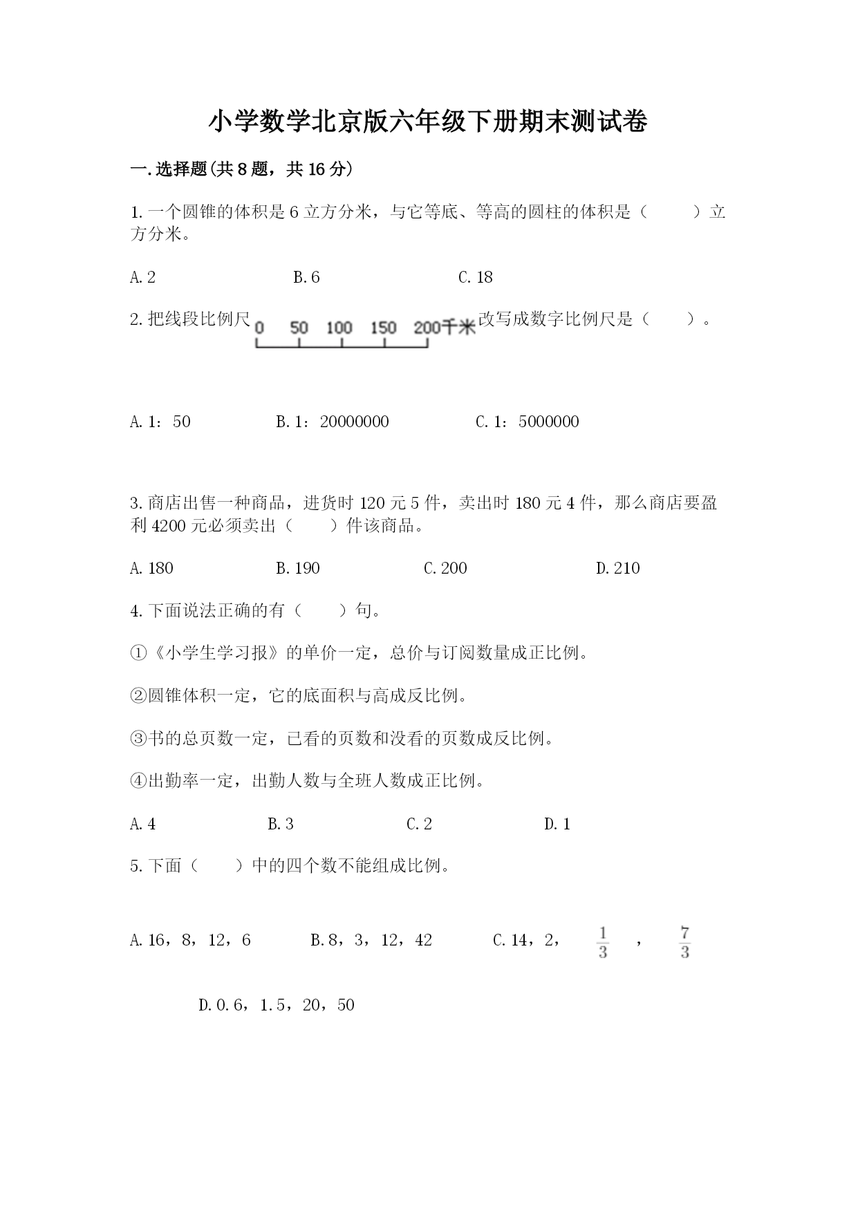 小学数学北京版六年级下册期末测试卷一.选择题(共8题,共16分)1.一个圆锥的体积是6立方分米,与它等底、等高的圆柱的体积是()立方分米。A.2B.6C.182.把线段比例尺改写成数字比例尺是()。A.1:50B.1:20000000C.1:50000003.商店出售一种商品,进货时120元5件,卖出时180元4件,那么商店要盈利4200元必须卖出()件该商品。A.180B.190C.200D.2104.下面说法正确的有()句。①《小学生学习报》的单价一定,总价与订阅数量成正比例。②圆锥体积一定,它的底面
