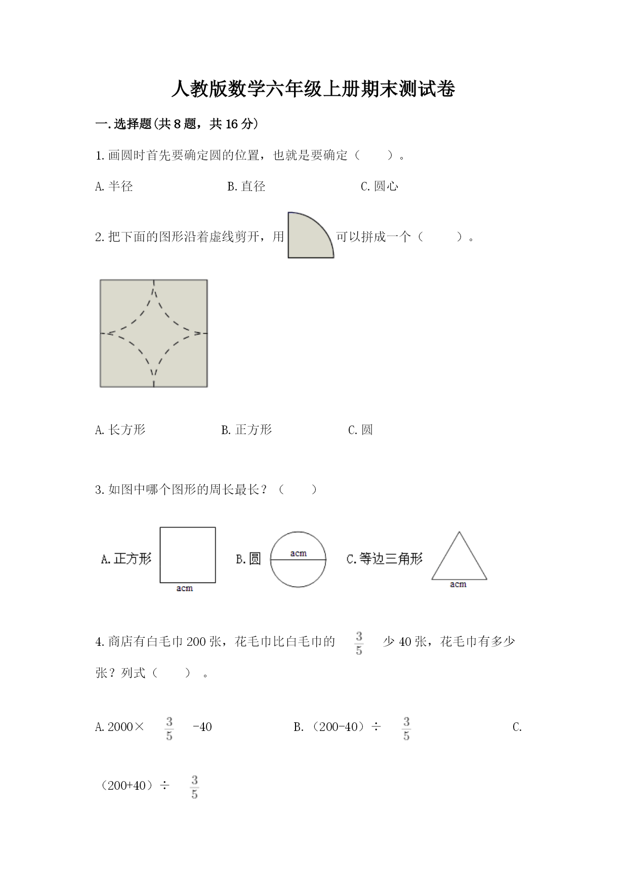 人教版数学六年级上册期末测试卷一.选择题(共8题,共16分)1.画圆时首先要确定圆的位置,也就是要确定()。A.半径B.直径C.圆心2.把下面的图形沿着虚线剪开,用可以拼成一个()。A.长方形B.正方形C.圆3.如图中哪个图形的周长最长?()4.商店有白毛巾200张,花毛巾比白毛巾的少40张,花毛巾有多少张?列式()。A.2000×-40B.(200-40)÷C.(200+40)÷5.大圆的半径与小圆半径的比为2:1,则大、小圆周长之比是()。A.4:1B.π:1C.2:16.六年级男生有132人,比女生