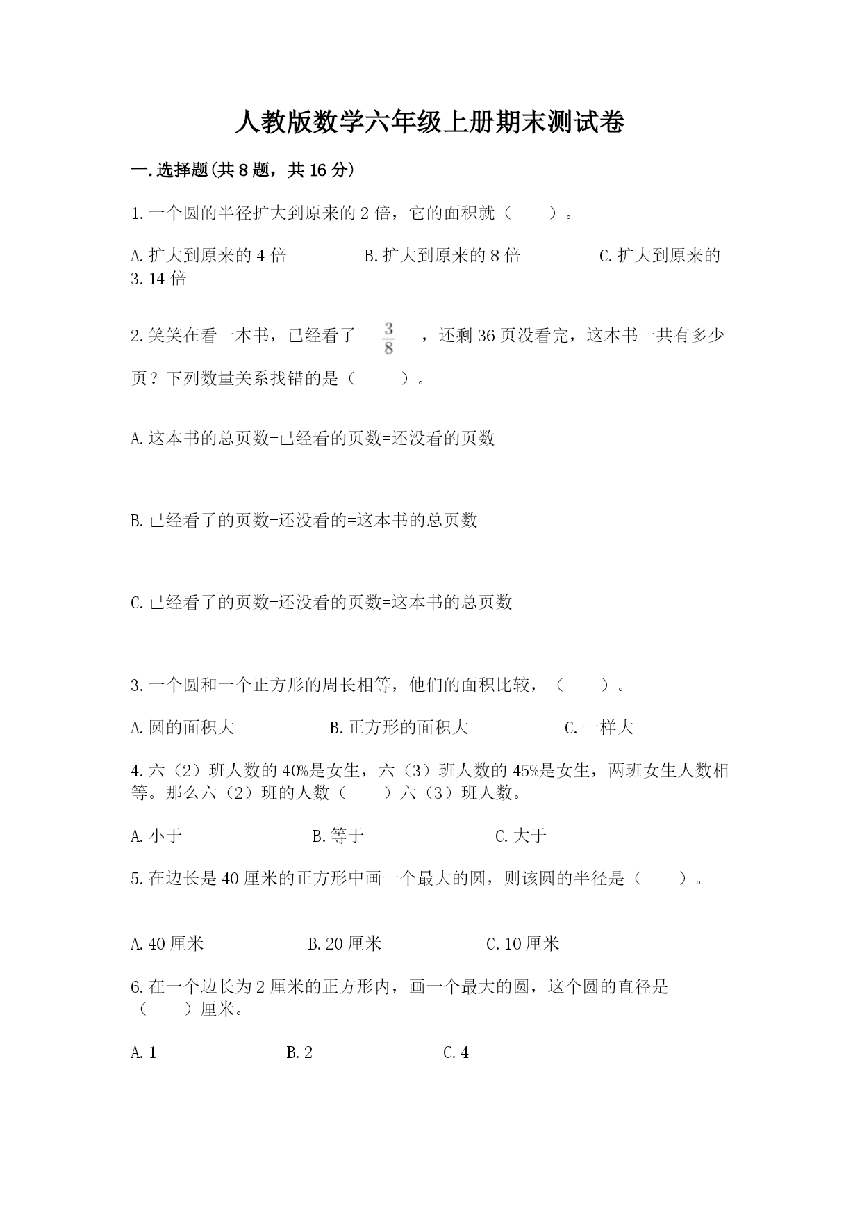 人教版数学六年级上册期末测试卷一.选择题(共8题,共16分)1.一个圆的半径扩大到原来的2倍,它的面积就()。A.扩大到原来的4倍B.扩大到原来的8倍C.扩大到原来的3.14倍2.笑笑在看一本书,已经看了,还剩36页没看完,这本书一共有多少页?下列数量关系找错的是()。A.这本书的总页数-已经看的页数=还没看的页数B.已经看了的页数+还没看的=这本书的总页数C.已经看了的页数-还没看的页数=这本书的总页数3.一个圆和一个正方形的周长相等,他们的面积比较,()。A.圆的面积大B.正方形的面积大C.一样大4.