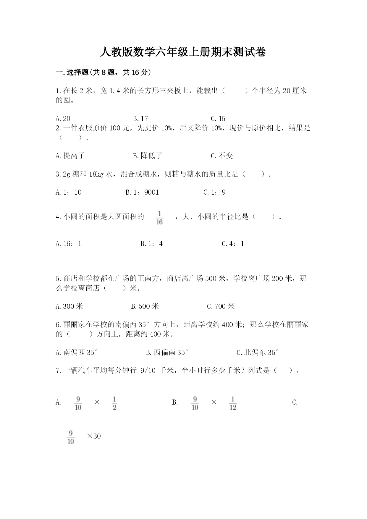 人教版数学六年级上册期末测试卷一.选择题(共8题,共16分)1.在长2米,宽1.4米的长方形三夹板上,能裁出()个半径为20厘米的圆。A.20B.17C.152.一件衣服原价100元,先提价10%,后又降价10%,现价与原价相比,结果是()。A.提高了B.降低了C.不变3.2g糖和18kg水,混合成糖水,则糖与糖水的质量比是()。A.1:10B.1:9001C.1:94.小圆的面积是大圆面积的,大、小圆的半径比是()。A.16:1B.1:4C.4:15.商店和学校都在广场的正南方,商店离广场500米,学校