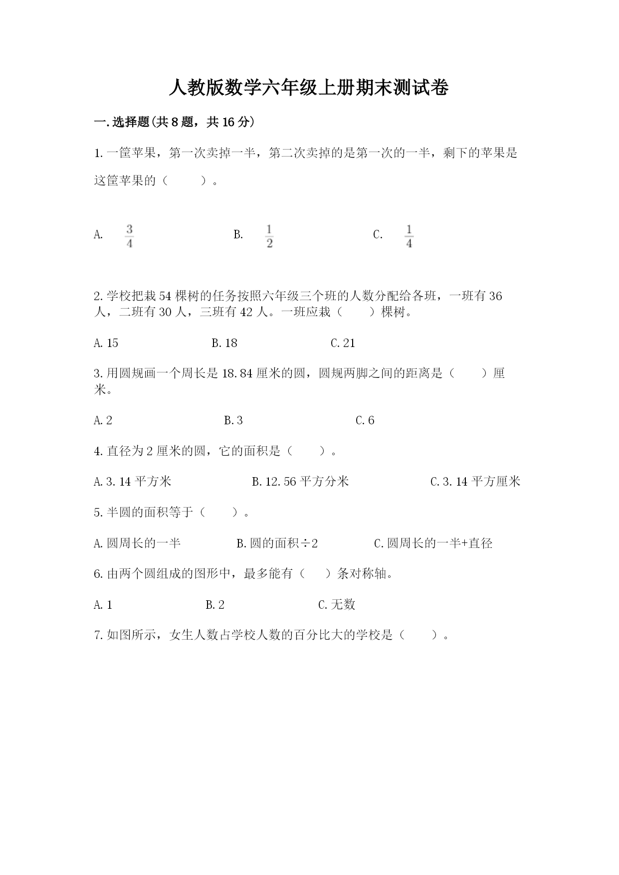 人教版数学六年级上册期末测试卷一.选择题(共8题,共16分)1.一筐苹果,第一次卖掉一半,第二次卖掉的是第一次的一半,剩下的苹果是这筐苹果的()。A.B.C.2.学校把栽54棵树的任务按照六年级三个班的人数分配给各班,一班有36人,二班有30人,三班有42人。一班应栽()棵树。A.15B.18C.213.用圆规画一个周长是18.84厘米的圆,圆规两脚之间的距离是()厘米。A.2B.3C.64.直径为2厘米的圆,它的面积是()。A.3.14平方米B.12.56平方分米C.3.14平方厘米5.半圆的面积等于(