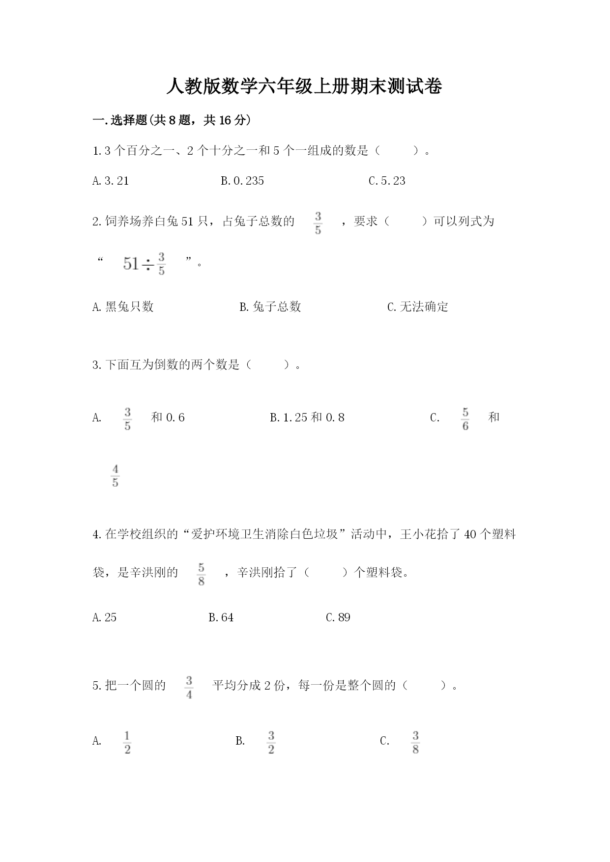 人教版数学六年级上册期末测试卷一.选择题(共8题,共16分)1.3个百分之一、2个十分之一和5个一组成的数是()。A.3.21B.0.235C.5.232.饲养场养白兔51只,占兔子总数的,要求()可以列式为“”。A.黑兔只数B.兔子总数C.无法确定3.下面互为倒数的两个数是()。A.和0.6B.1.25和0.8C.和4.在学校组织的“爱护环境卫生消除白色垃圾”活动中,王小花拾了40个塑料袋,是辛洪刚的,辛洪刚拾了()个塑料袋。A.25B.64C.895.把一个圆的平均分成2份,每一份是整个圆的()。A.