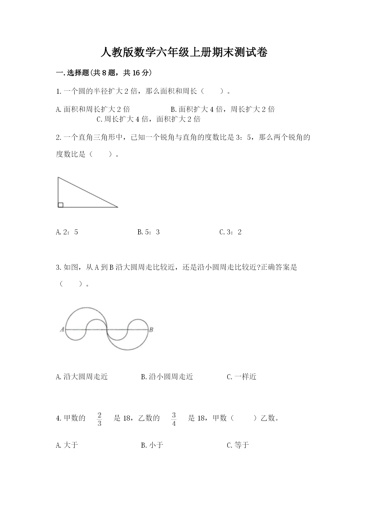 人教版数学六年级上册期末测试卷一.选择题(共8题,共16分)1.一个圆的半径扩大2倍,那么面积和周长()。A.面积和周长扩大2倍B.面积扩大4倍,周长扩大2倍C.周长扩大4倍,面积扩大2倍2.一个直角三角形中,已知一个锐角与直角的度数比是3:5,那么两个锐角的度数比是()。A.2:5B.5:3C.3:23.如图,从A到B沿大圆周走比较近,还是沿小圆周走比较近?正确答案是()。A.沿大圆周走近B.沿小圆周走近C.一样近4.甲数的是18,乙数的是18,甲数()乙数。A.大于B.小于C.等于5.育新小学六年级学