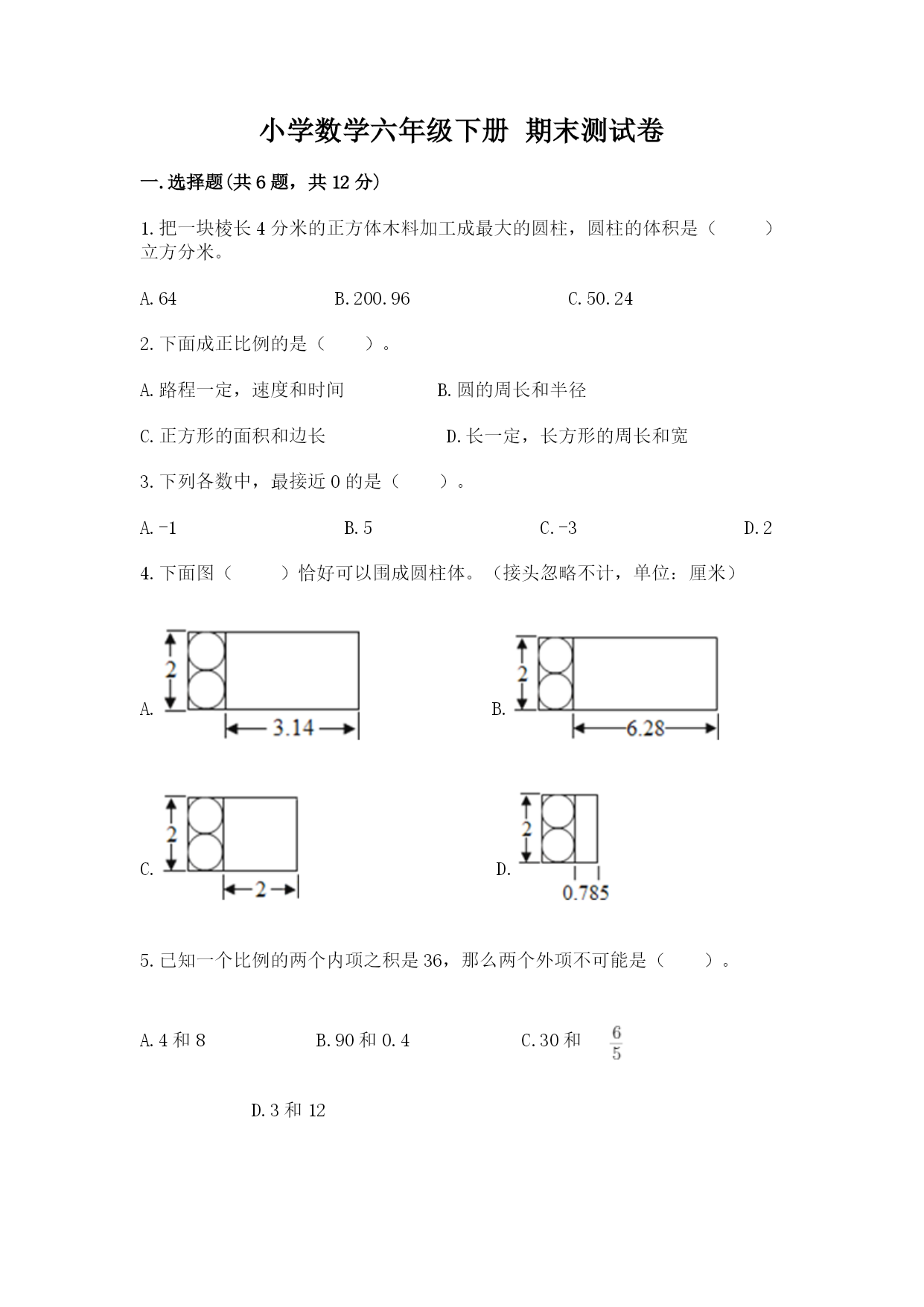 小学数学六年级下册期末测试卷一.选择题(共6题,共12分)1.把一块棱长4分米的正方体木料加工成最大的圆柱,圆柱的体积是()立方分米。A.64B.200.96C.50.242.下面成正比例的是()。A.路程一定,速度和时间B.圆的周长和半径C.正方形的面积和边长D.长一定,长方形的周长和宽3.下列各数中,最接近0的是()。A.-1B.5C.-3D.24.下面图()恰好可以围成圆柱体。(接头忽略不计,单位:厘米)A.B.C.D.5.已知一个比例的两个内项之积是36,那么两个外项不可能是()。A.4和8B.9