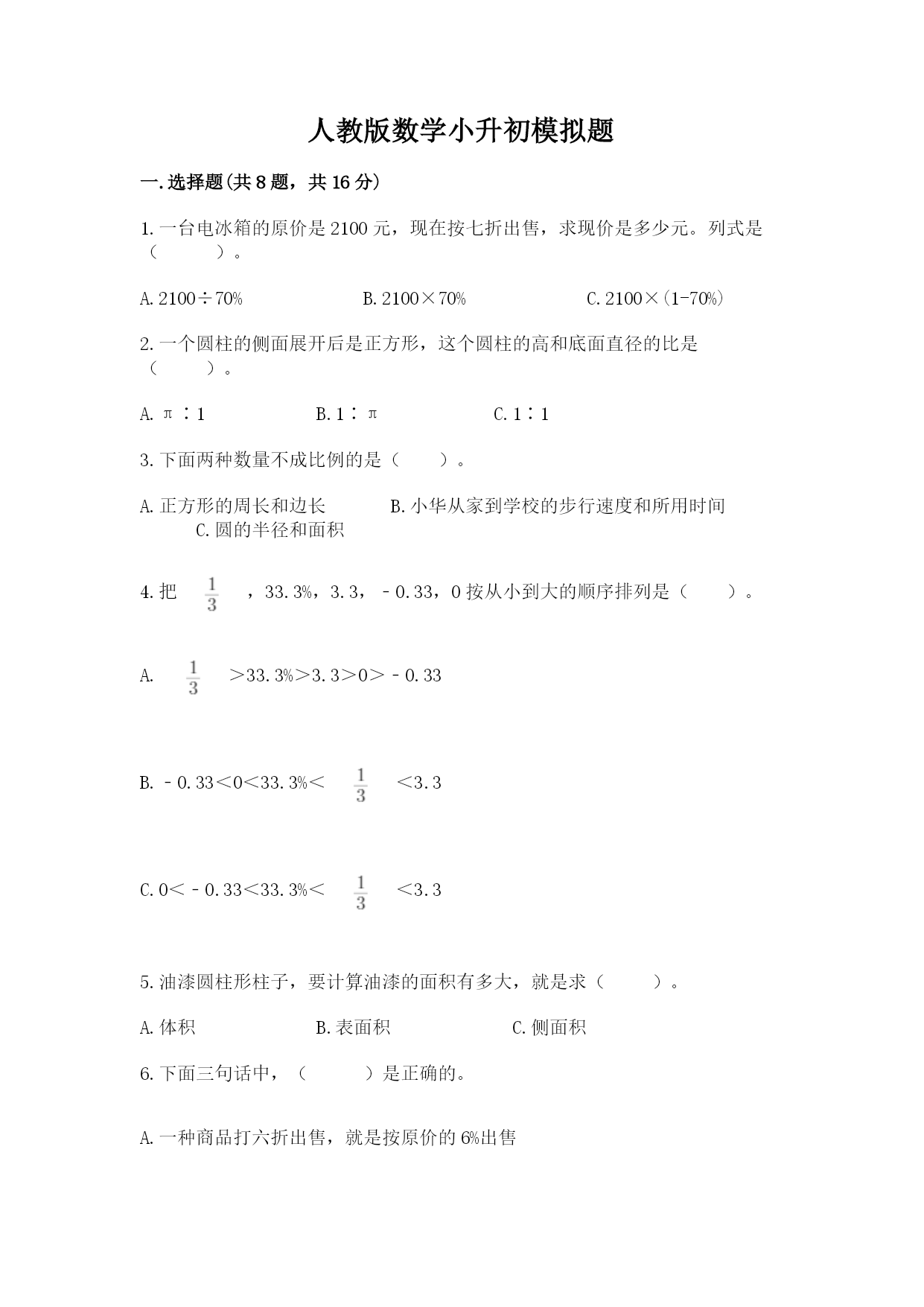 人教版数学小升初模拟题一.选择题(共8题,共16分)1.一台电冰箱的原价是2100元,现在按七折出售,求现价是多少元。列式是()。A.2100÷70%B.2100×70%C.2100×(1-70%)2.一个圆柱的侧面展开后是正方形,这个圆柱的高和底面直径的比是()。A.π∶1B.1∶πC.1∶13.下面两种数量不成比例的是()。A.正方形的周长和边长B.小华从家到学校的步行速度和所用时间C.圆的半径和面积4.把,33.3%,3.3,﹣0.33,0按从小到大的顺序排列是()。A.>33.3%>3.3>0>﹣