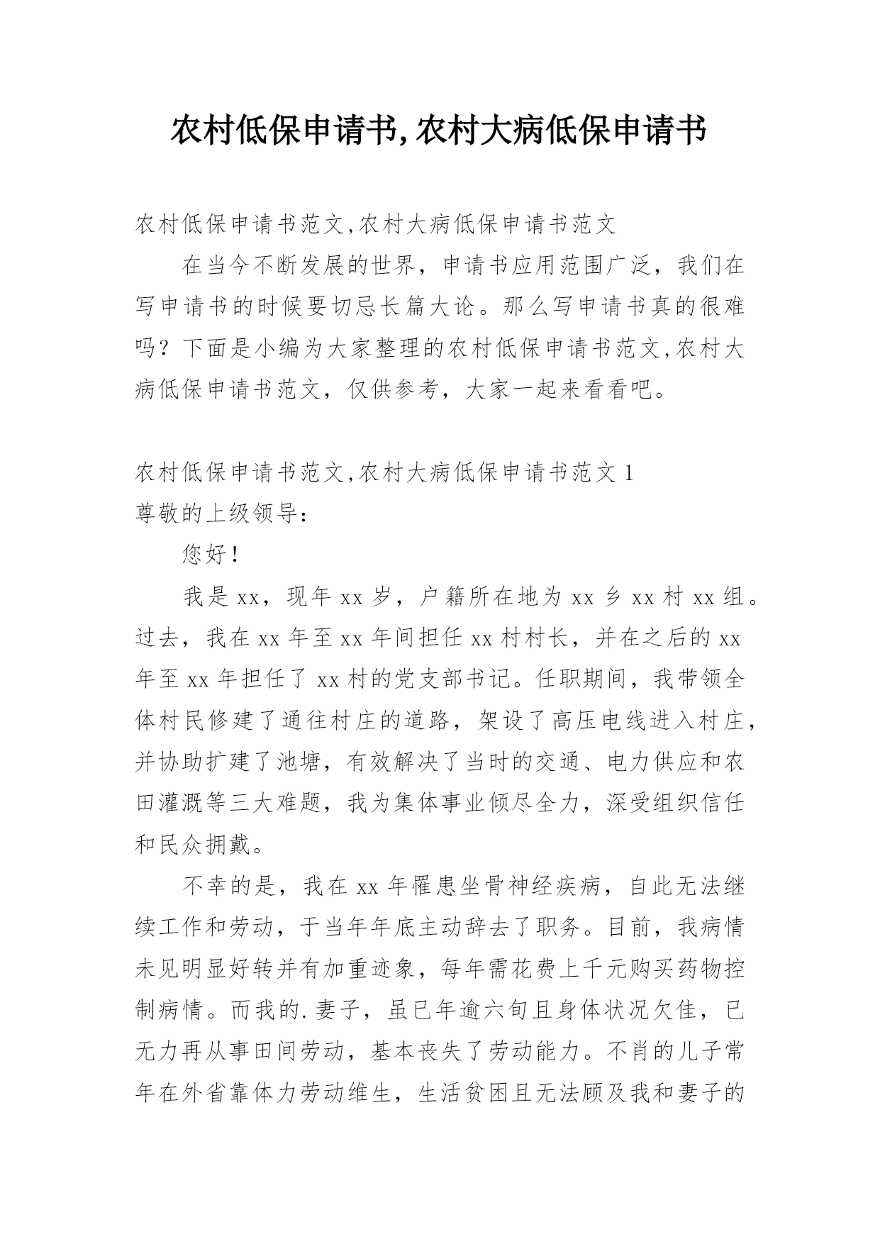 农村低保申请书,农村大病低保申请书农村低保申请书范文,农村大病低保申请书范文在当今不断发展的世界,申请书应用范围广泛,我们在写申请书的时候要切忌长篇大论。那么写申请书真的很难吗?下面是小编为大家整理的农村低保申请书范文,农村大病低保申请书范文,仅供参考,大家一起来看看吧。农村低保申请书范文,农村大病低保申请书范文1尊敬的上级领导:您好!我是xx,现年xx岁,户籍所在地为xx乡xx村xx组。过去,我在xx年至xx年间担任xx村村长,并在之后的xx年至xx年担任了xx村的党支部书记。任职期间,我带领全体村民修