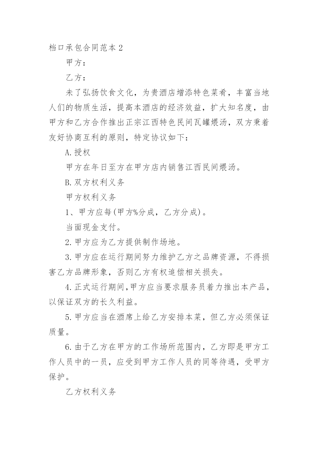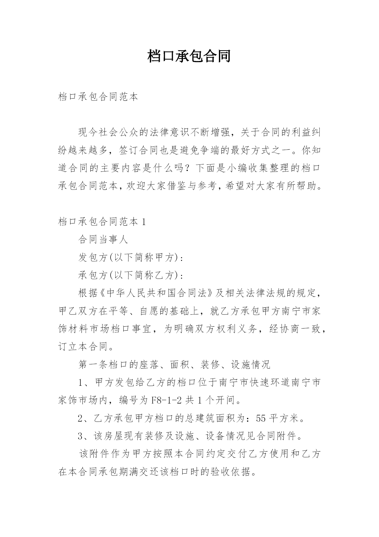 档口承包合同档口承包合同范本现今社会公众的法律意识不断增强,关于合同的利益纠纷越来越多,签订合同也是避免争端的最好方式之一。你知道合同的主要内容是什么吗?下面是小编收集整理的档口承包合同范本,欢迎大家借鉴与参考,希望对大家有所帮助。档口承包合同范本1合同当事人发包方(以下简称甲方):承包方(以下简称乙方):根据《中华人民共和国合同法》及相关法律法规的规定,甲乙双方在平等、自愿的基础上,就乙方承包甲方南宁市家饰材料市场档口事宜,为明确双方权利义务,经协商一致,订立本合同。第一条档口的座落、面积、装修、设施情