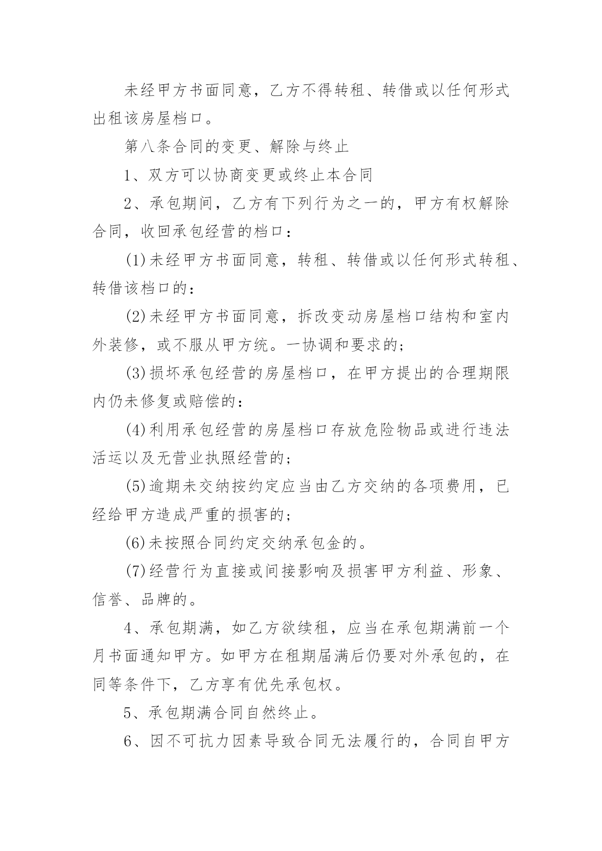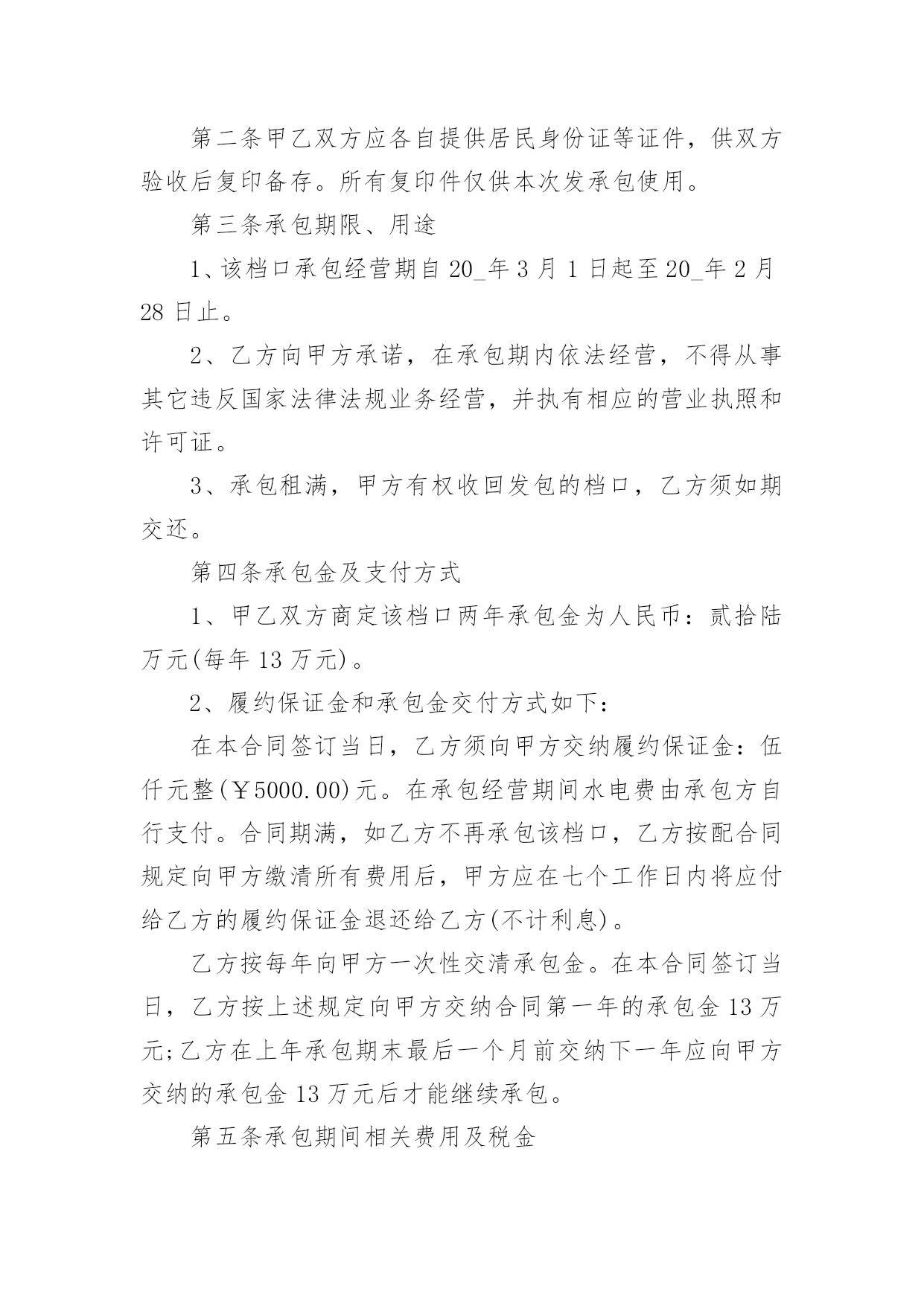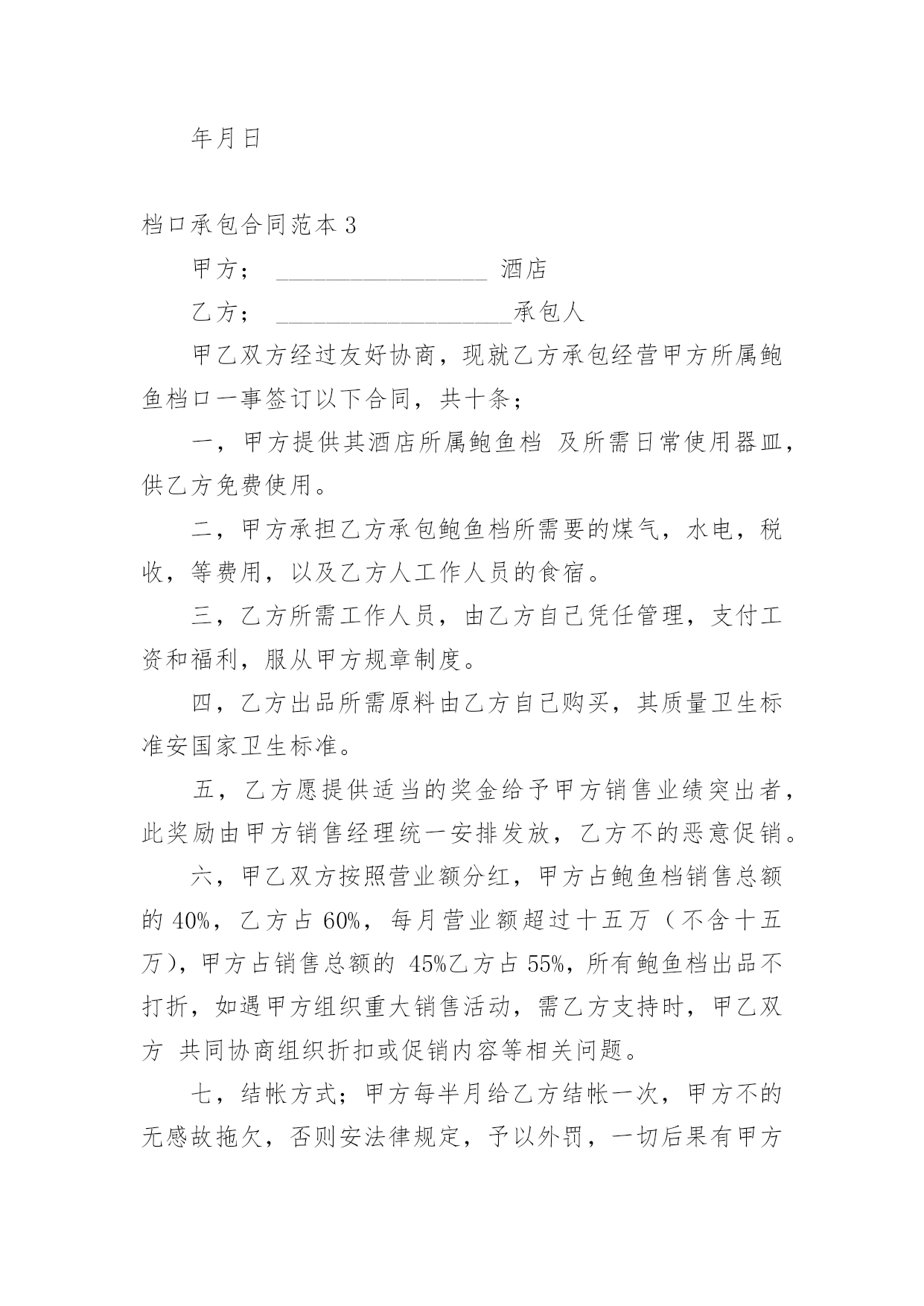 档口承包合同在人们的法律意识不断增强的社会,合同出现的次数越来越多,它也是实现专业化合作的纽带。知道吗,写合同可是有方法的哦,下面是小编收集整理的档口承包合同,供大家参考借鉴,希望可以帮助到有需要的朋友。档口承包合同1甲方;_________________酒店乙方;___________________承包人甲乙双方经过友好协商,现就乙方承包经营甲方所属鲍鱼档口一事签订以下合同,共十条;一,甲方提供其酒店所属鲍鱼档及所需日常使用器皿,供乙方免费使用。二,甲方承担乙方承包鲍鱼档所需要的煤气,水电,税收,等