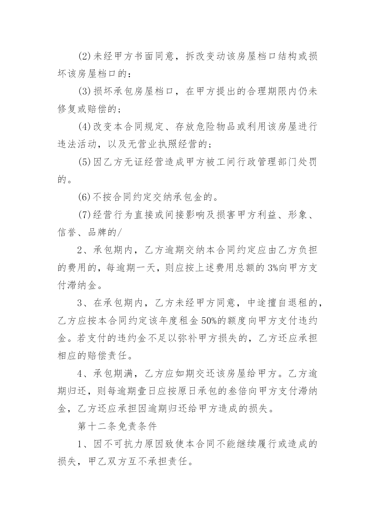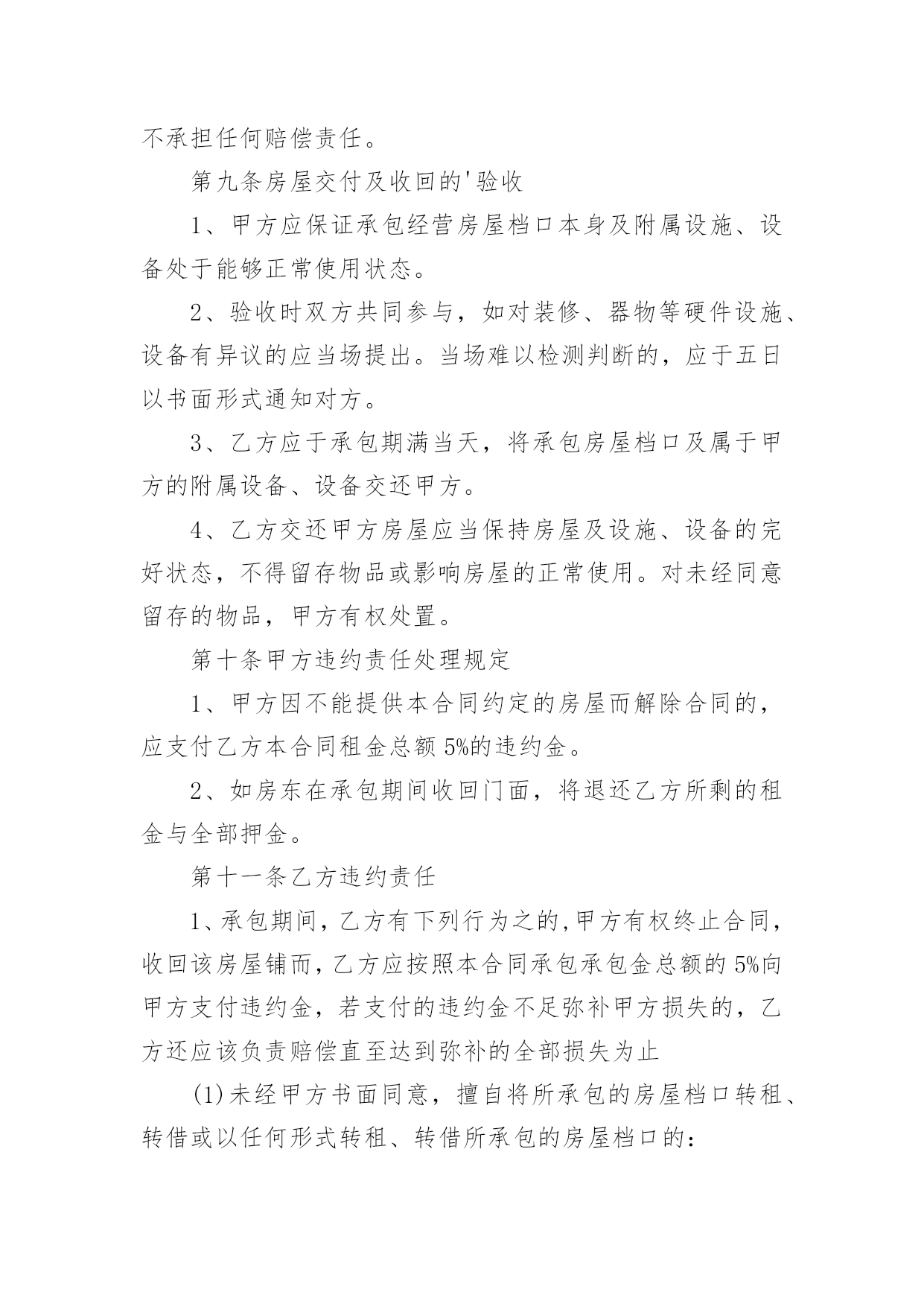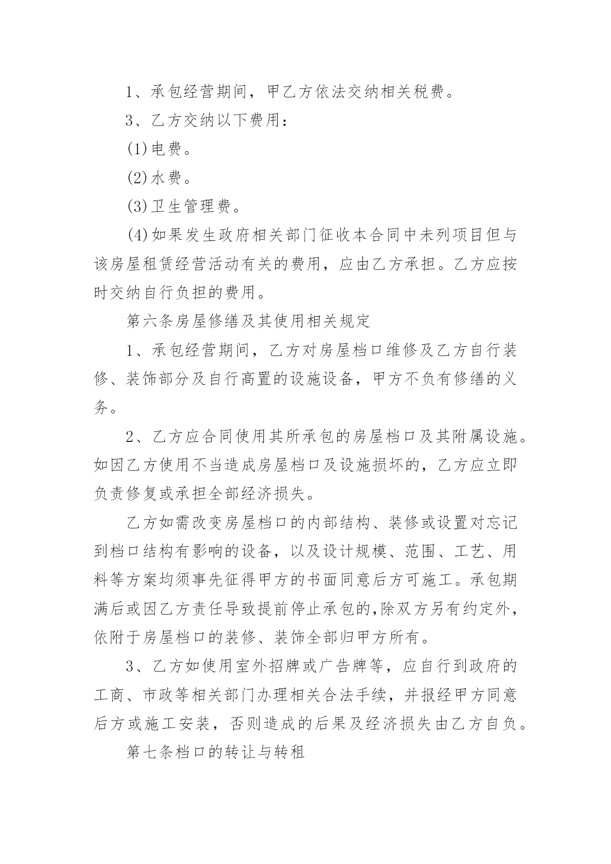 档口承包合同在人们的法律意识不断增强的社会,合同出现的次数越来越多,它也是实现专业化合作的纽带。知道吗,写合同可是有方法的哦,下面是小编收集整理的档口承包合同,供大家参考借鉴,希望可以帮助到有需要的朋友。档口承包合同1甲方;_________________酒店乙方;___________________承包人甲乙双方经过友好协商,现就乙方承包经营甲方所属鲍鱼档口一事签订以下合同,共十条;一,甲方提供其酒店所属鲍鱼档及所需日常使用器皿,供乙方免费使用。二,甲方承担乙方承包鲍鱼档所需要的煤气,水电,税收,等