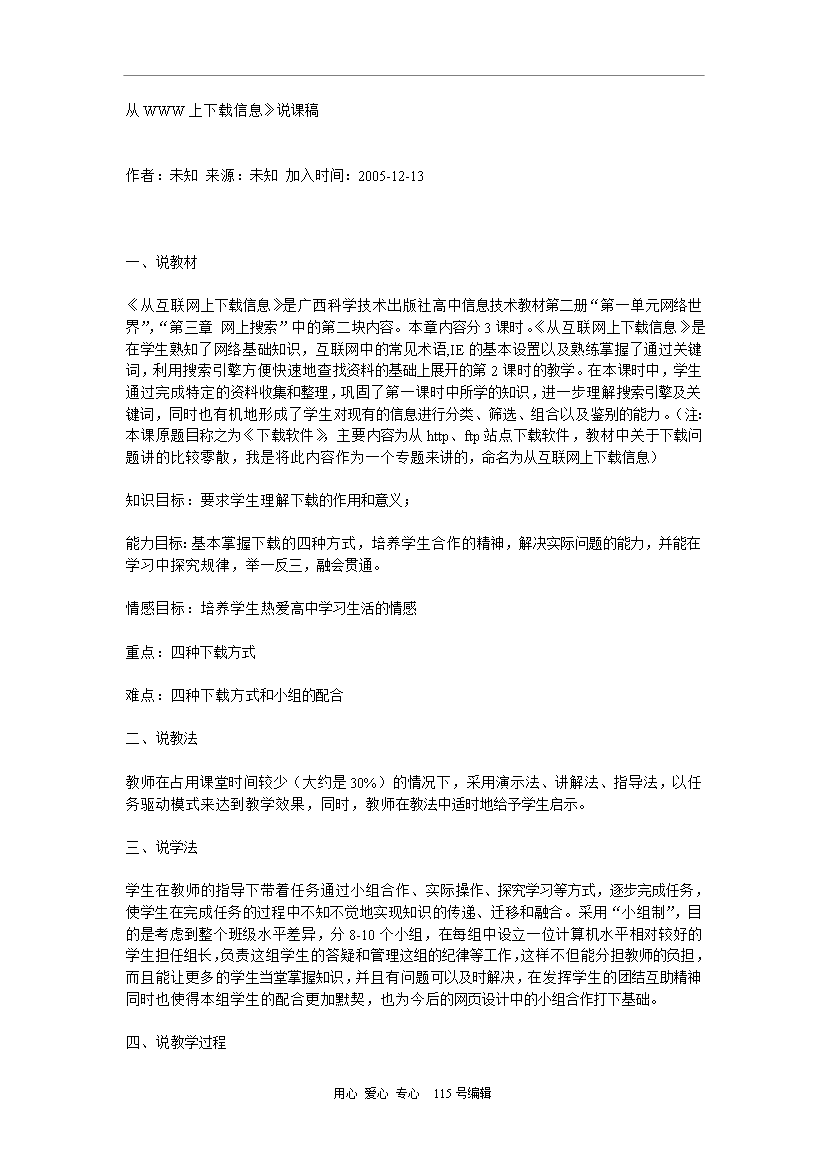 用心爱心专心115号编辑从WWW上下载信息》说课稿作者:未知来源:未知加入时间:2005-12-13一、说教材《从互联网上下载信息》是广西科学技术出版社高中信息技术教材第二册“第一单元网络世界”,“第三章网上搜索”中的第二块内容。本章内容分3课时。《从互联网上下载信息》是在学生熟知了网络基础知识,互联网中的常见术语,IE的基本设置以及熟练掌握了通过关键词,利用搜索引擎方便快速地查找资料的基础上展开的第2课时的教学。在本课时中,学生通过完成特定的资料收集和整理,巩固了第一课时中所学的知识,进一步理解搜索引擎