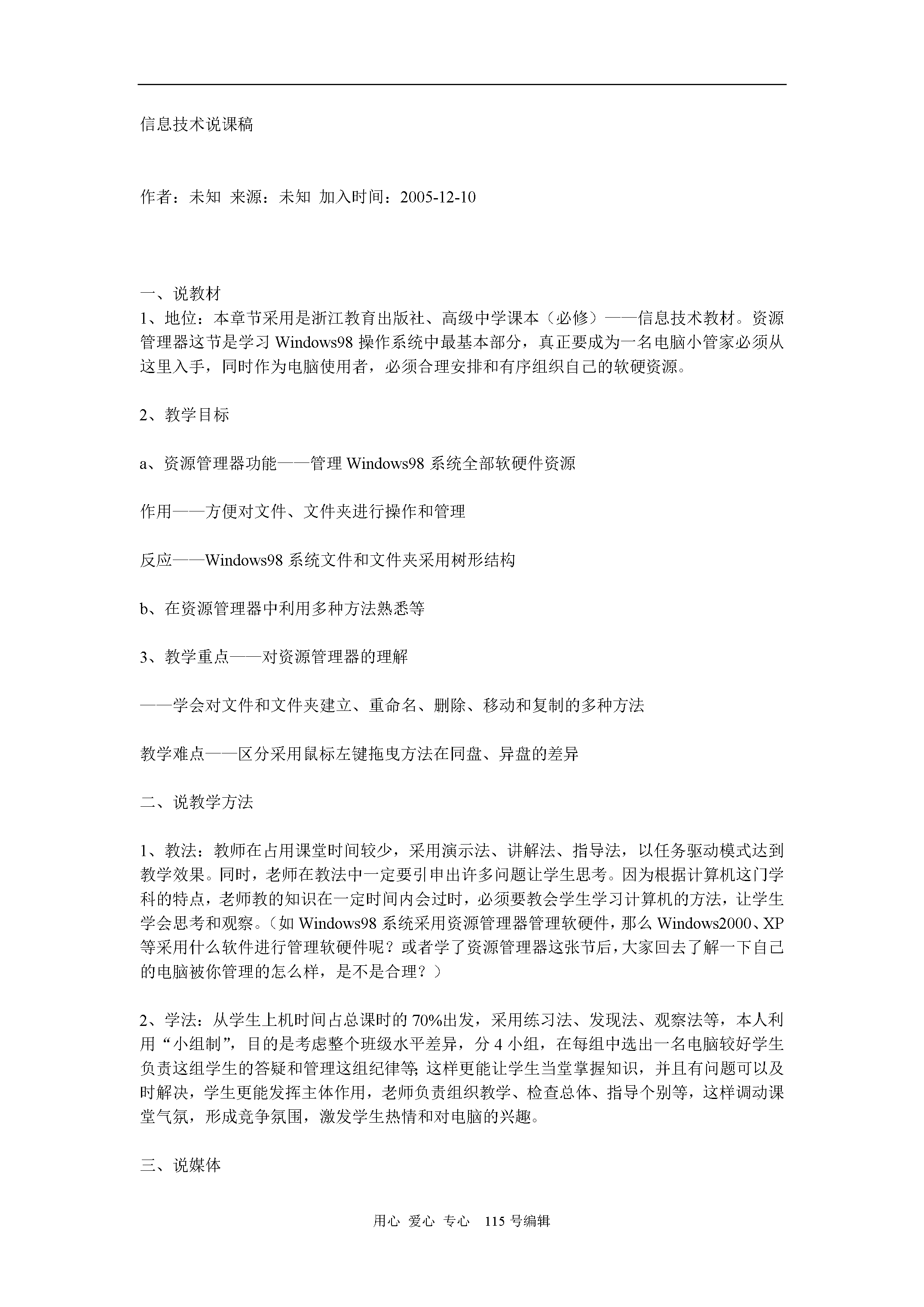 用心爱心专心115号编辑信息技术说课稿作者:未知来源:未知加入时间:2005-12-10一、说教材1、地位:本章节采用是浙江教育出版社、高级中学课本(必修)——信息技术教材。资源管理器这节是学习Windows98操作系统中最基本部分,真正要成为一名电脑小管家必须从这里入手,同时作为电脑使用者,必须合理安排和有序组织自己的软硬资源。2、教学目标a、资源管理器功能——管理Windows98系统全部软硬件资源作用——方便对文件、文件夹进行操作和管理反应——Windows98系统文件和文件夹采用树形结构b、在资源