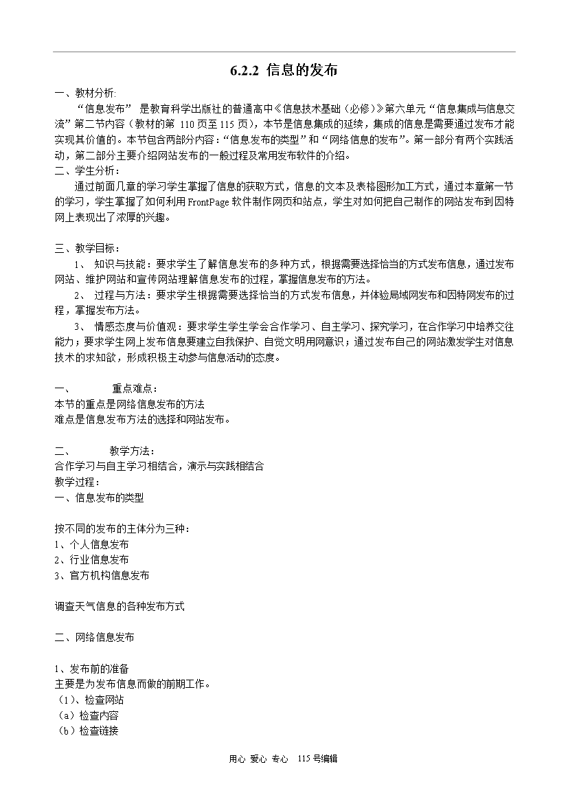 用心爱心专心115号编辑6.2.2信息的发布一、教材分析:“信息发布”是教育科学出版社的普通高中《信息技术基础(必修)》第六单元“信息集成与信息交流”第二节内容(教材的至115页),本节是信息集成的延续,集成的信息是需要通过发布才能实现其价值的。本节包含两部分内容:“信息发布的类型”和“网络信息的发布”。第一部分有两个实践活动,第二部分主要介绍网站发布的一般过程及常用发布软件的介绍。二、学生分析:通过前面几章的学习学生掌握了信息的获取方式,信息的文本及表格图形加工方式,通过本章第一节的学习,学生