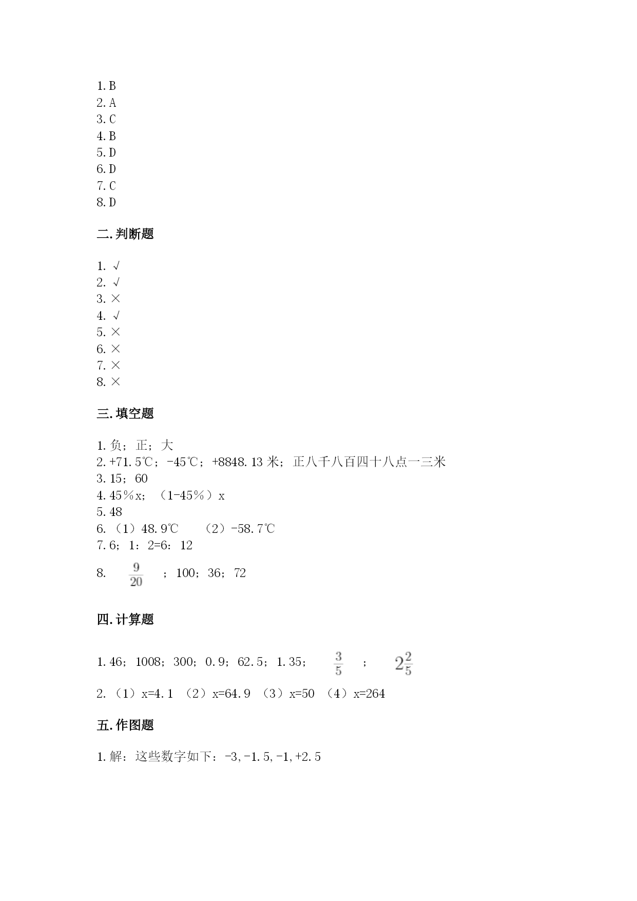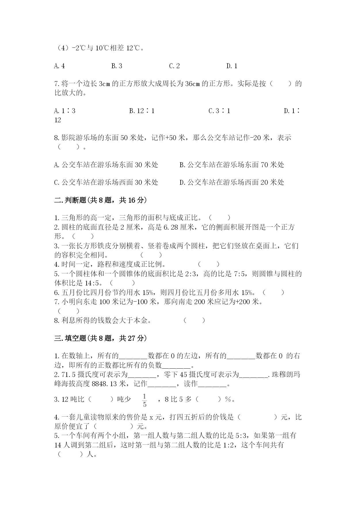 苏教版六年级下册期末真题卷一.选择题(共8题,共16分)1.某出版社出版某种书,今年每册书的成本比去年增加10%,但售价不变,因此每本利润下降了40%,那么今年这种书的成本在售价中所占的百分数是多少?下列正确的选项是()。A.86%B.88%C.89%2.一个三角形的三个内角的度数比是1∶2∶7,这个三角形是()。A.锐角三角形B.钝角三角形C.直角三角形3.低于正常水位0.13米记作-0.13米,高于正常水位0.04米则记作()。A.+0.04米B.-0.04米C.+0.17米D.0米4.规定10吨记为