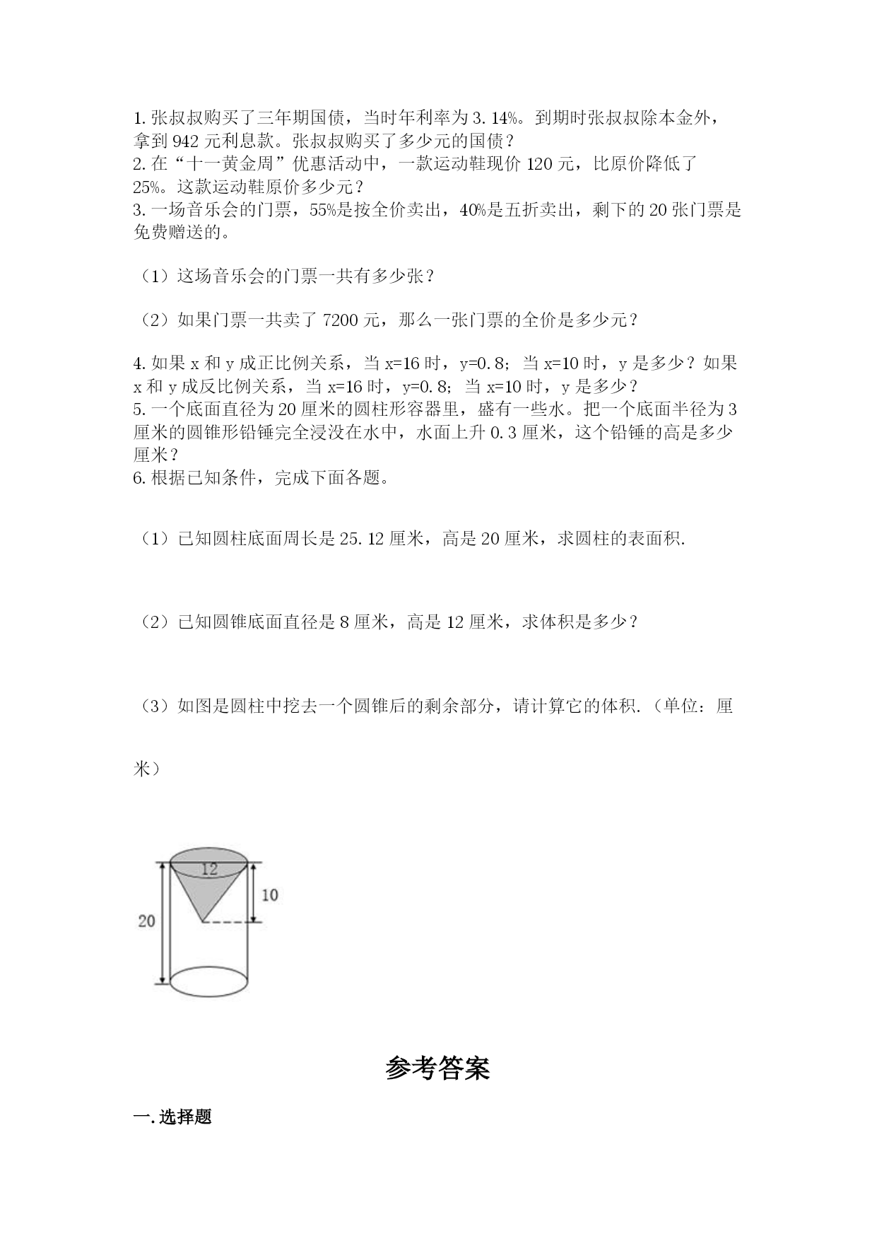苏教版六年级下册期末真题卷一.选择题(共8题,共16分)1.表示x和y成正比例的关系式是()。A.x+y=k(一定)B.=k(一定)C.xy=k(一定)2.一个圆锥的体积是36立方米,底面积是12平方米,它的高是()米。A.9B.6C.33.一根圆柱形木料,长6分米,横截面的直径是2分米,把它锯成3个一样的小圆柱体,表面积增加()平方分米。A.9.42B.12C.12.56D.18.844.阳光书店本月营业额为1800元,若按营业额的5%缴纳营业税,该书店本月应缴纳营业税()元。A.720B.90C.17