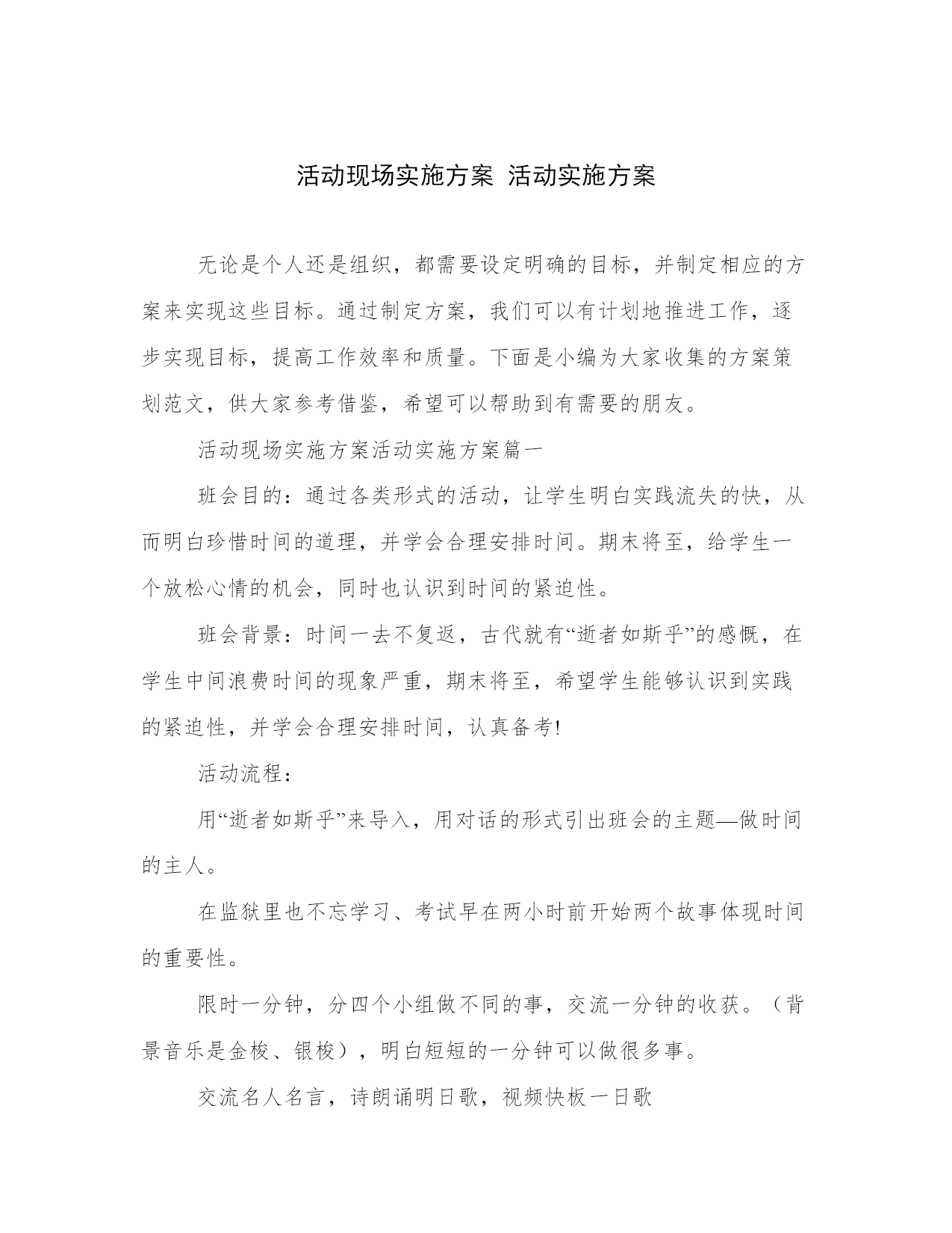 活动现场实施方案活动实施方案无论是个人还是组织,都需要设定明确的目标,并制定相应的方案来实现这些目标。通过制定方案,我们可以有计划地推进工作,逐步实现目标,提高工作效率和质量。下面是小编为大家收集的方案策划范文,供大家参考借鉴,希望可以帮助到有需要的朋友。活动现场实施方案活动实施方案篇一班会目的:通过各类形式的活动,让学生明白实践流失的快,从而明白珍惜时间的道理,并学会合理安排时间。期末将至,给学生一个放松心情的机会,同时也认识到时间的紧迫性。班会背景:时间一去不复返,古代就有“逝者如斯乎”的感慨,在学生